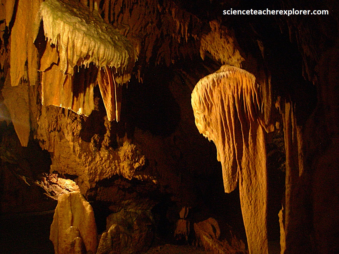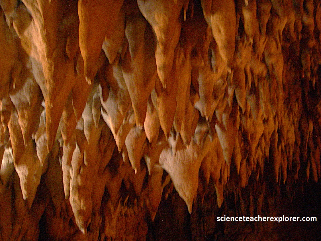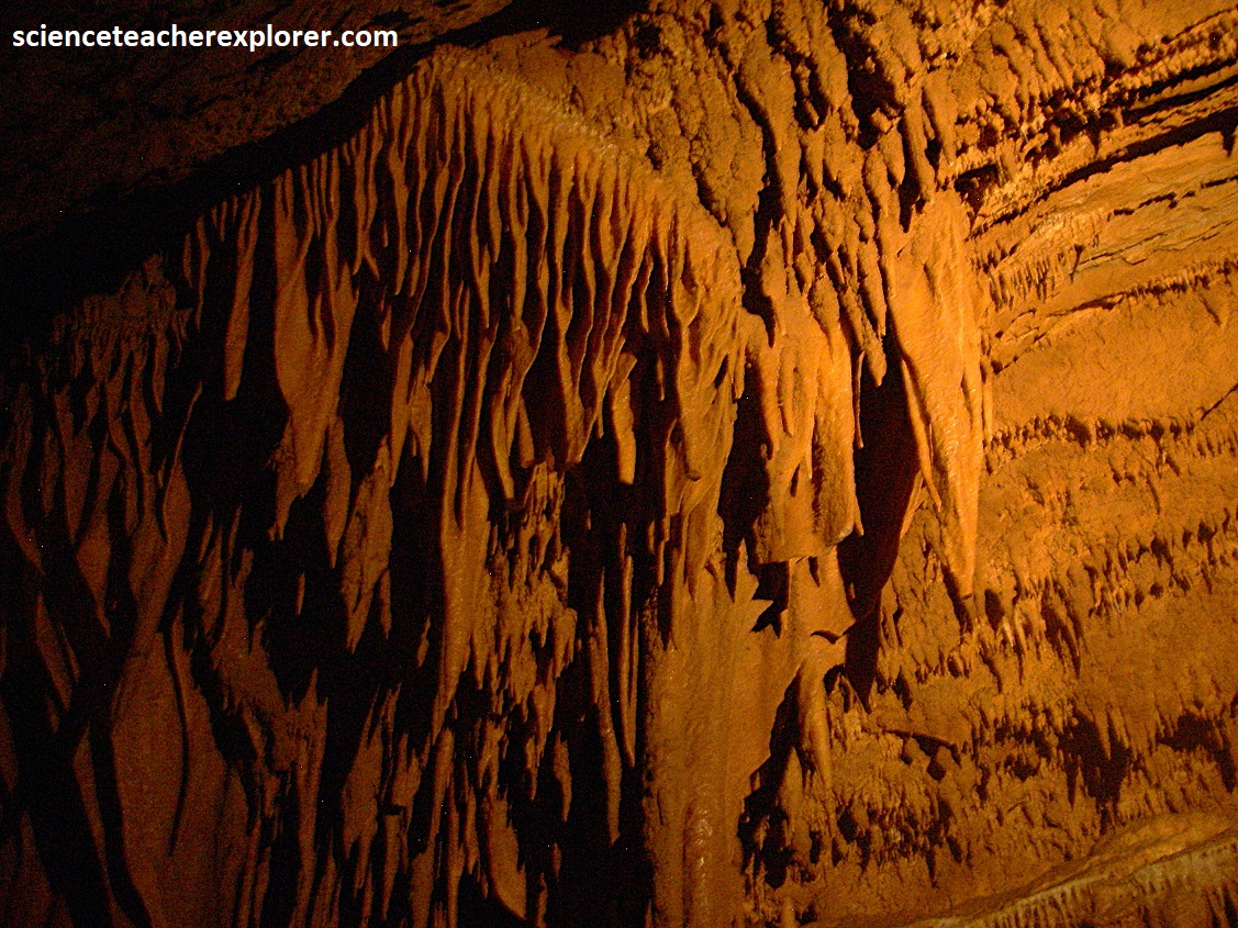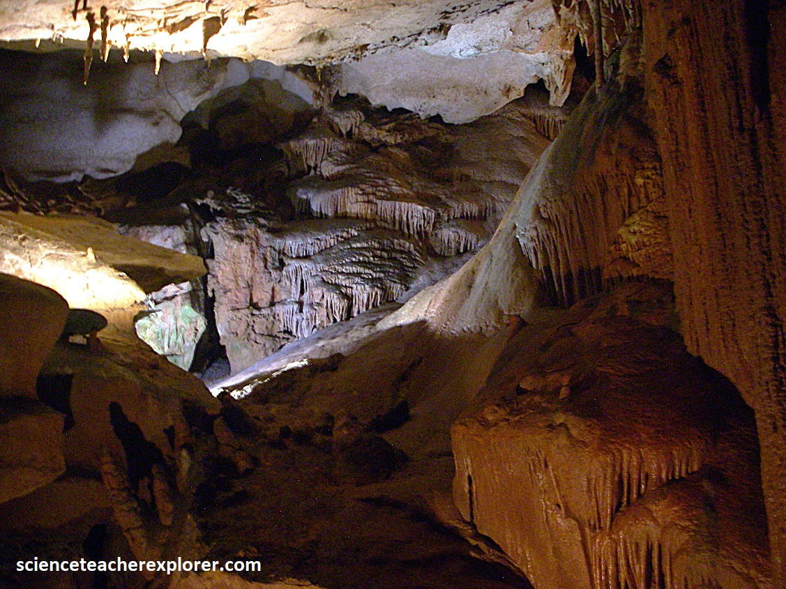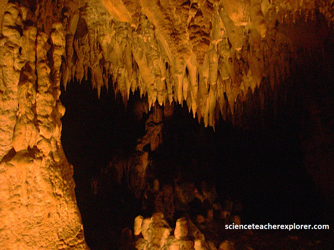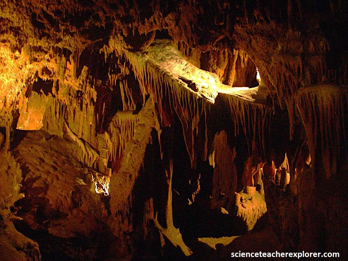 Thick sequences of carbonate strata that constitute the basement of the Shenandoah Valley create an ideal foundation for the development of caves. For millions of years, carbon dioxide, (from dilute concentrations of carbonic acid introduced by charged rains that have fallen to Earth), soaked the ground, seeped into available cracks, and slowly dissolved the limestone bedrock and forming sinuous underground passageways of great length. They have yet to find an end to the complex network of under-gound passageways at Endless Caverns. Overall, this dissolution results in the formation of a karst surface.