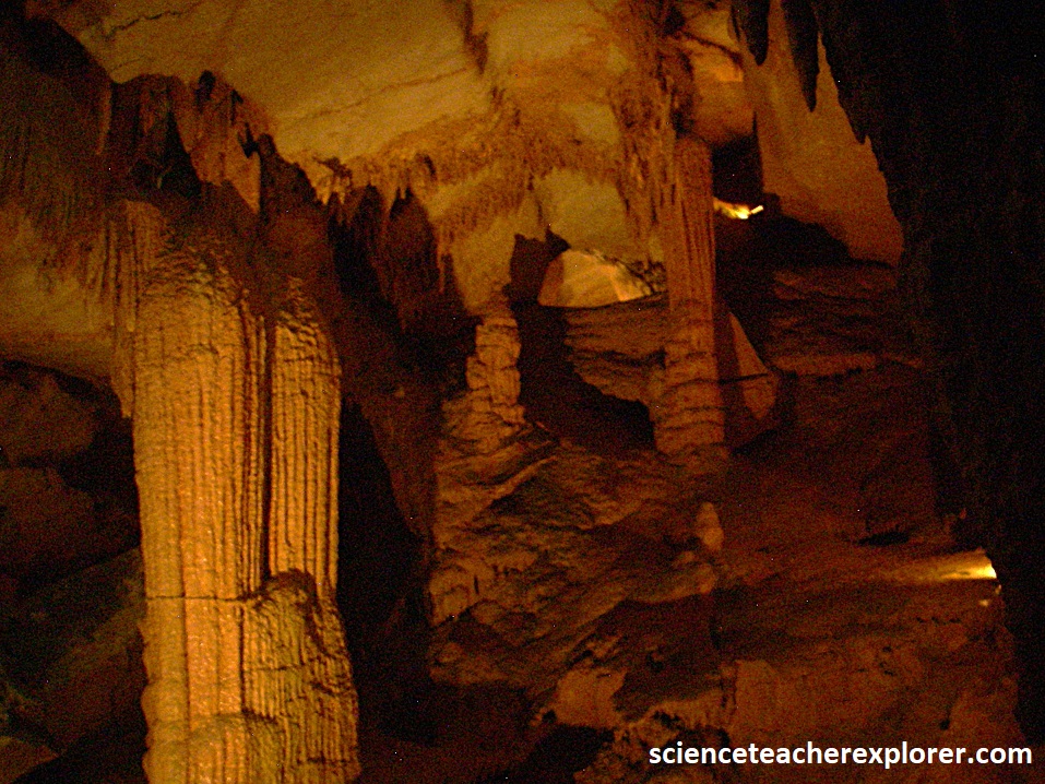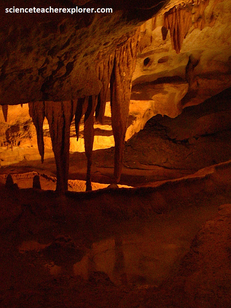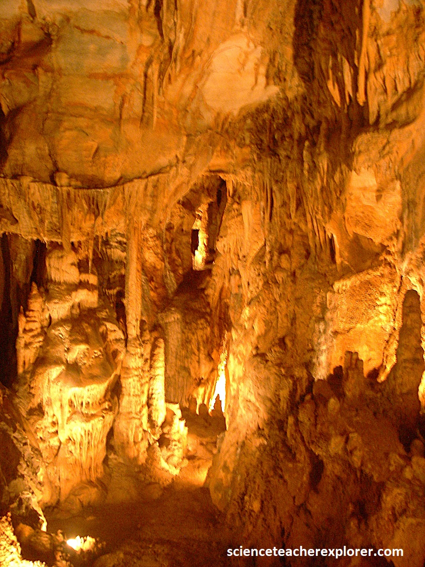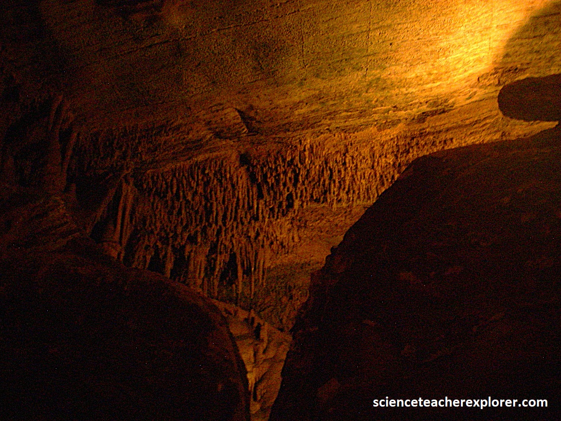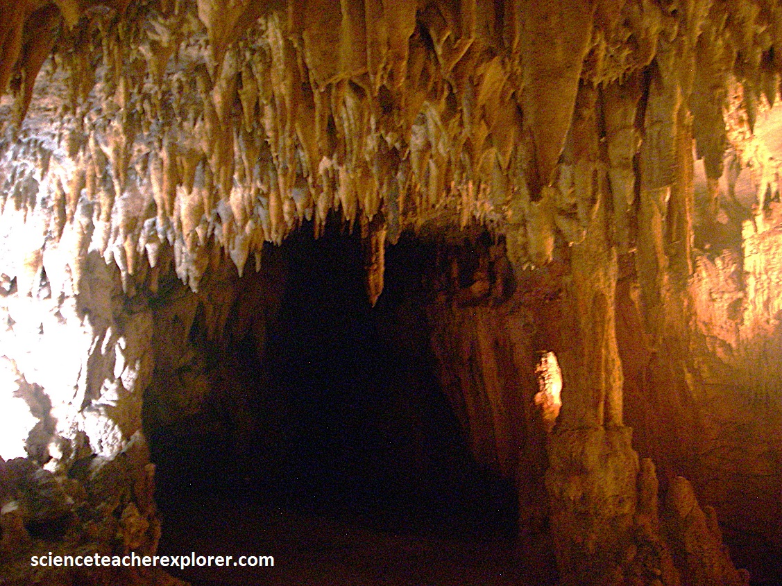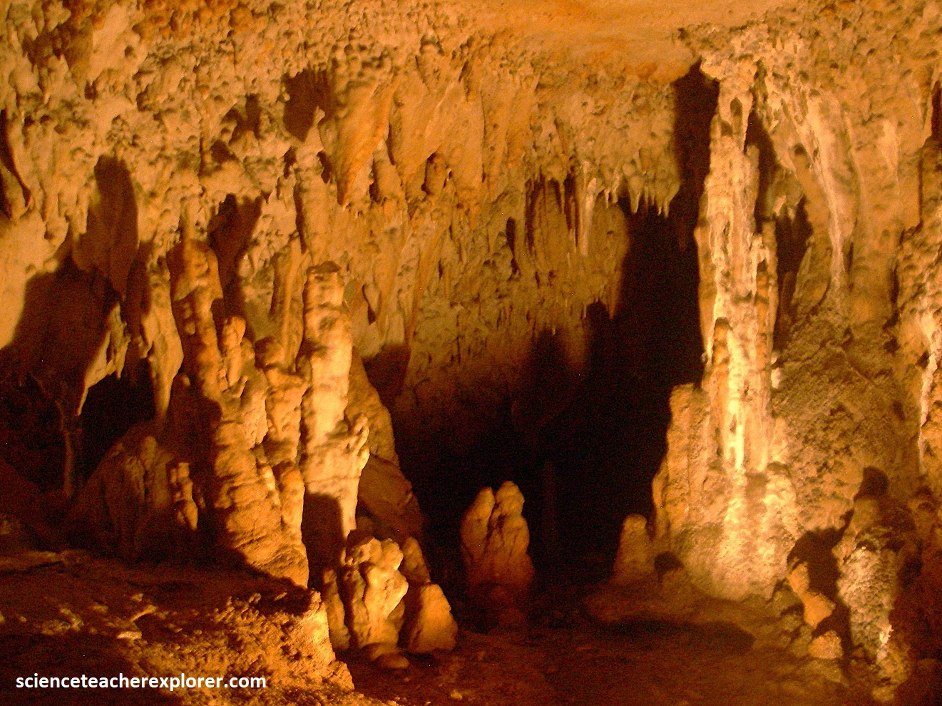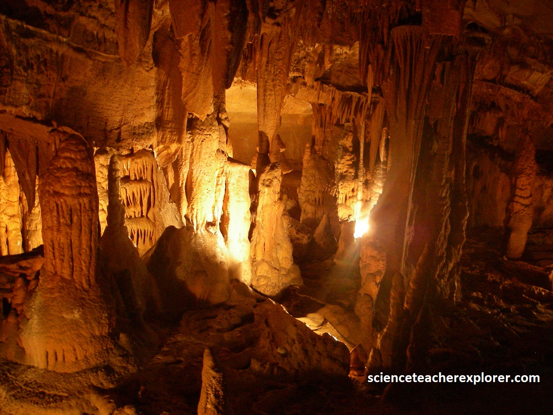 Thick sequences of carbonate strata that constitute the basement of the Shenandoah Valley create an ideal foundation for the development of caves. For millions of years, carbon dioxide, (from dilute concentrations of carbonic acid introduced by charged rains that have fallen to Earth), soaked the ground, seeped into available cracks, and slowly dissolved the limestone bedrock and forming sinuous underground passageways of great length. They have yet to find an end to the complex network of under-gound passageways at Endless Caverns. Overall, this dissolution results in the formation of a karst surface.