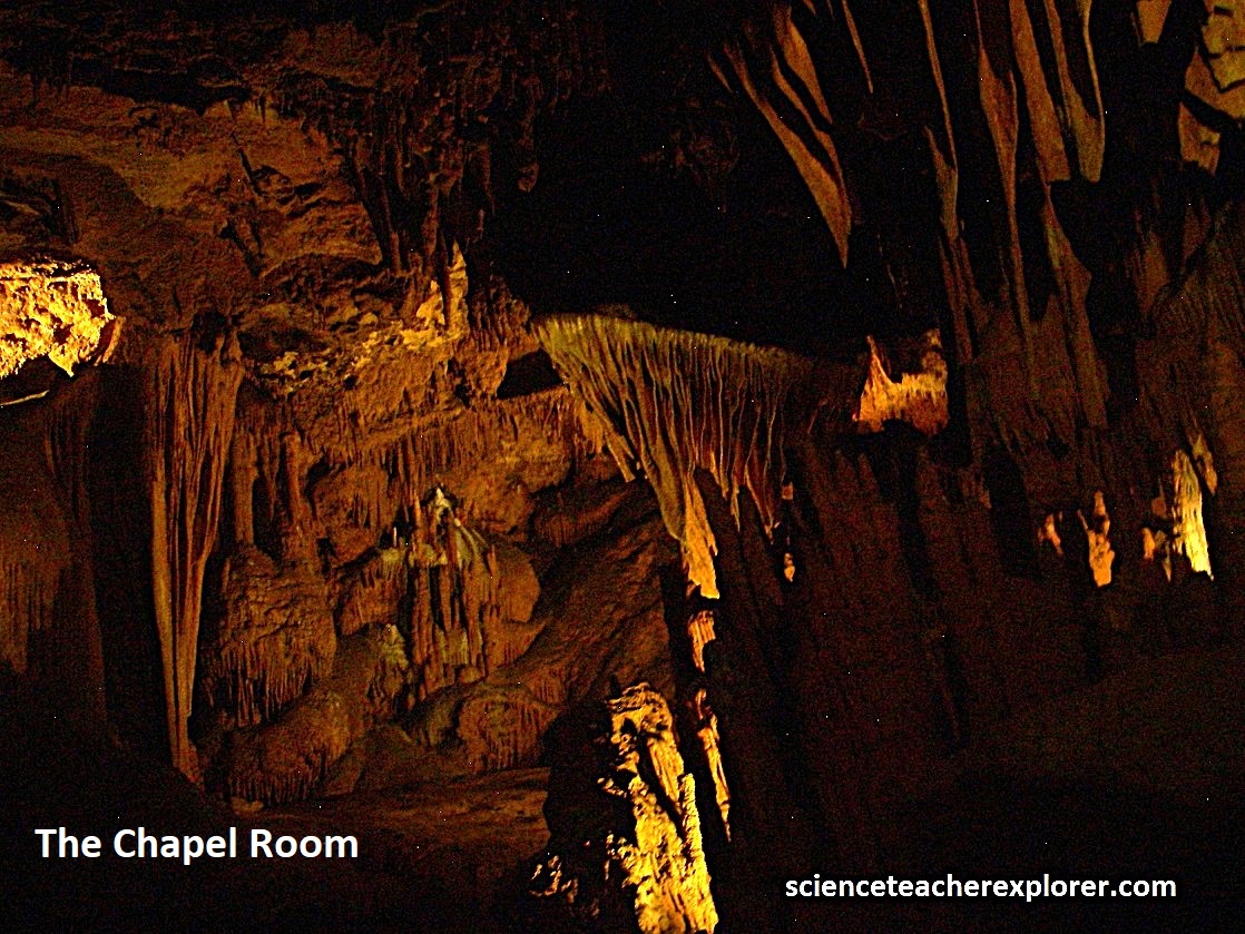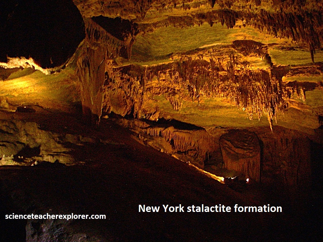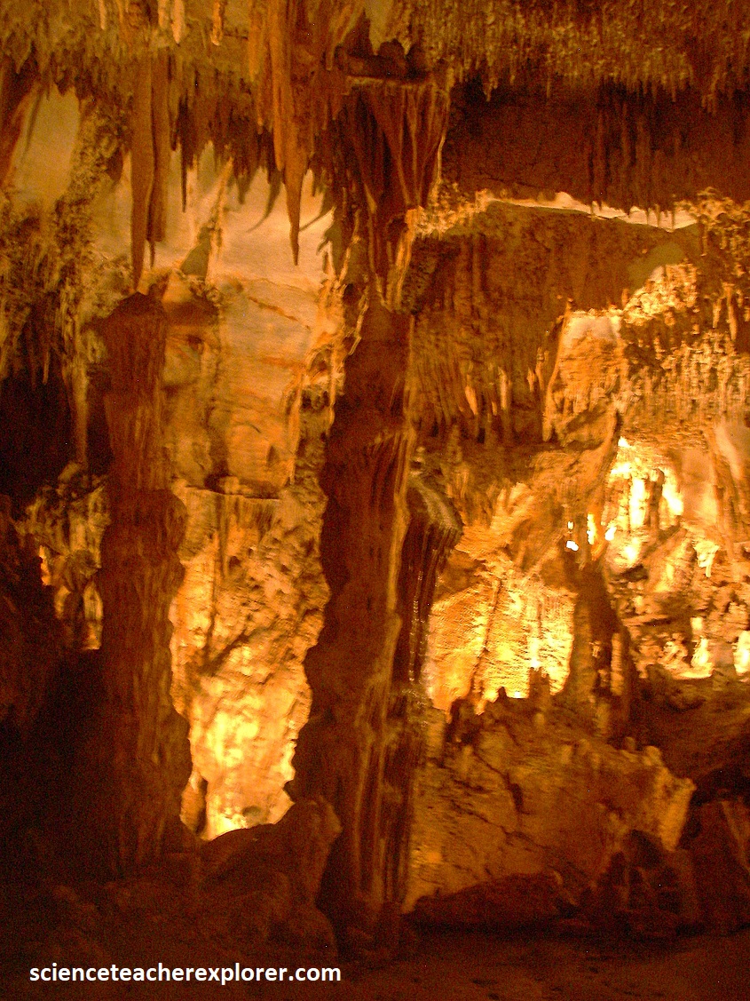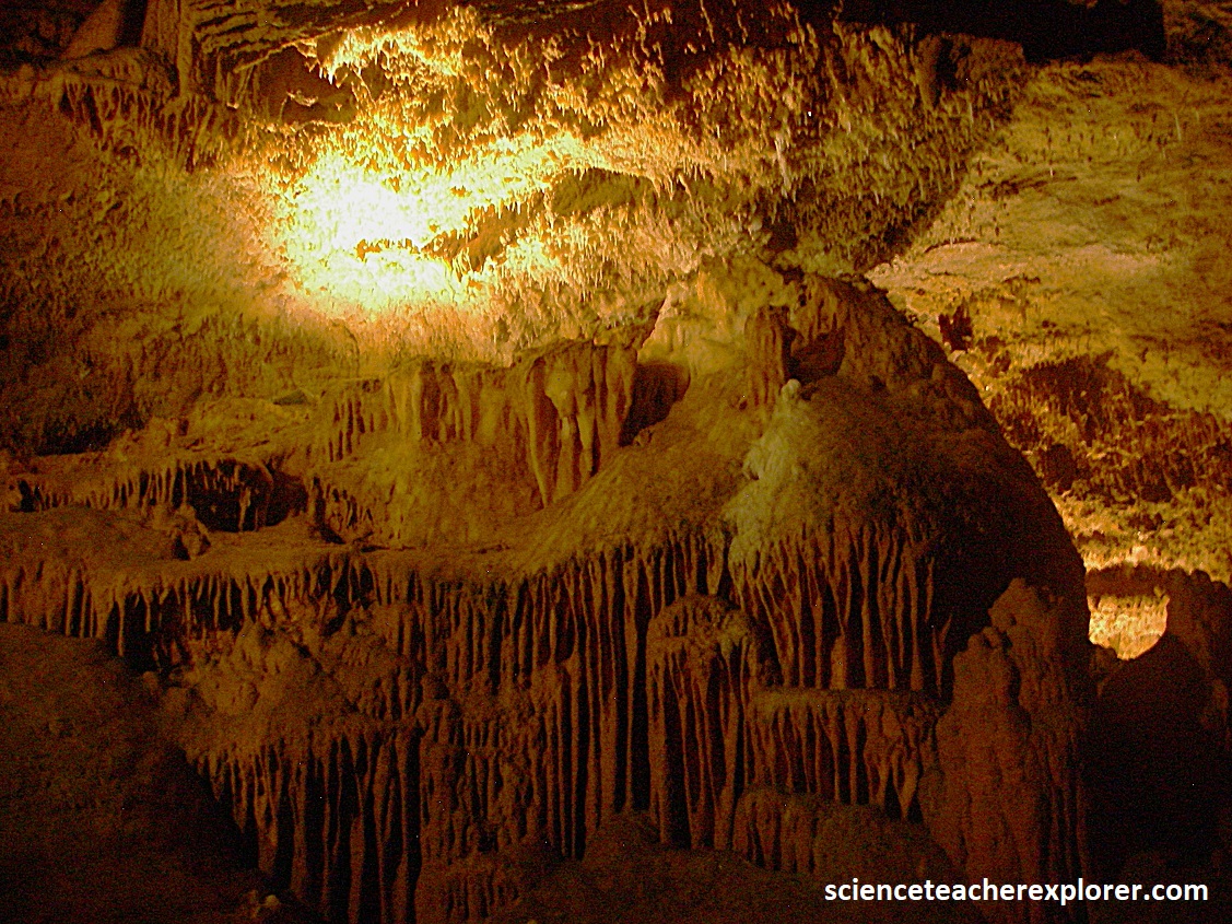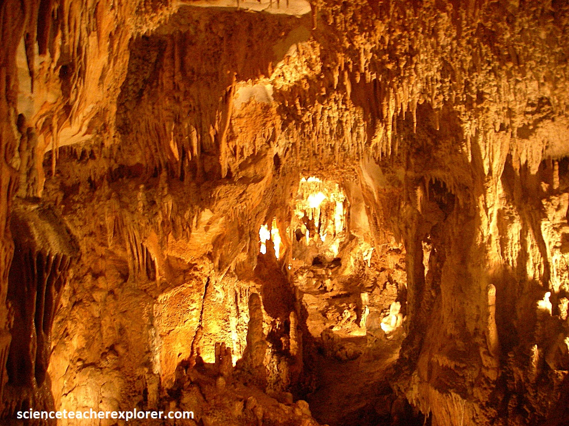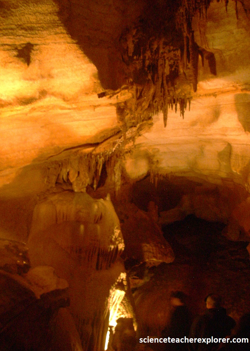Thick sequences of carbonate strata that constitute the basement of the Shenandoah Valley create an ideal foundation for the development of caves. For millions of years, carbon dioxide, (from dilute concentrations of carbonic acid introduced by charged rains that have fallen to Earth), soaked the ground, seeped into available cracks, and slowly dissolved the limestone bedrock and forming sinuous underground passageways of great length. They have yet to find an end to the complex network of under-gound passageways at Endless Caverns. Overall, this dissolution results in the formation of a karst surface.