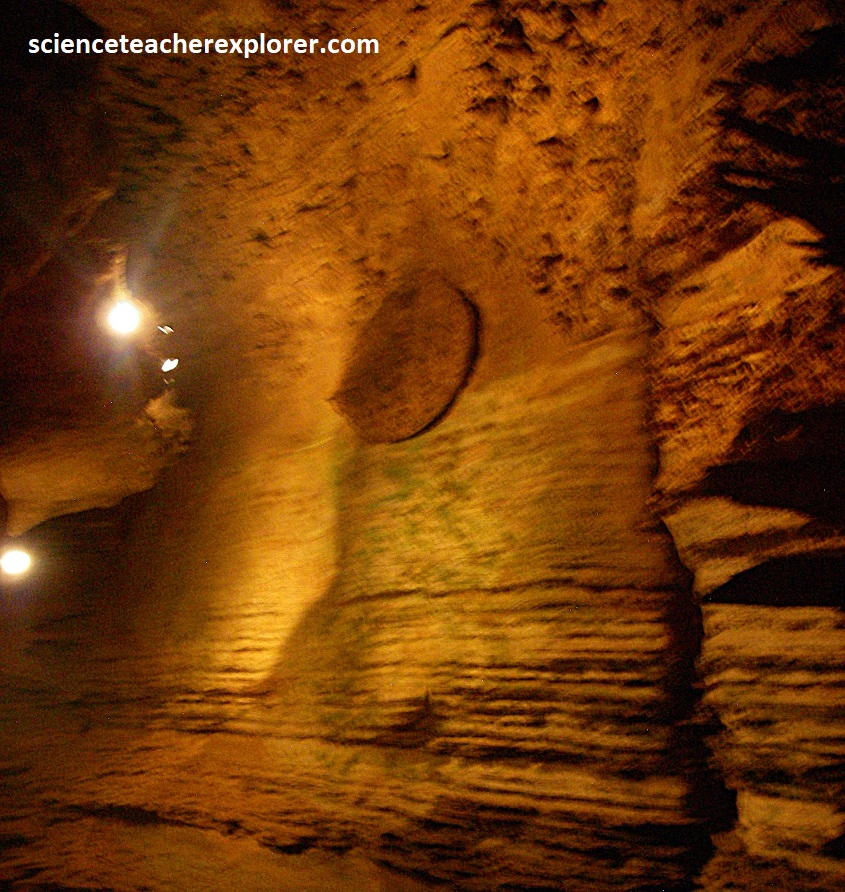 Pictured above and below, some of the rock in the Grand Cavern is made of microcrystalline limestone, (comprised of micro-particles), so tight that water cannot penetrate between the crystals. Compression, compaction, plus heat work together to create microcrystalline structures that cannot easily break. But sandstone, which is porous, is interbedded between layers of limestone, allows water to penetrate the layers and dissolve some of the rock to form the caverns.