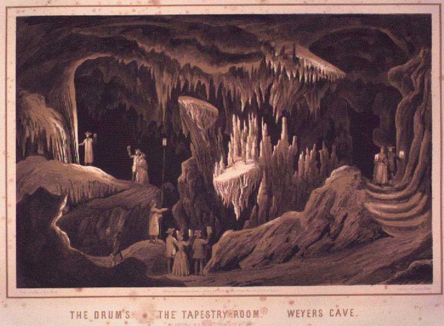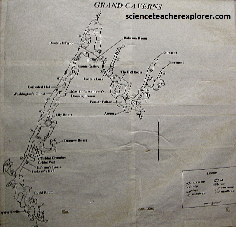 Cavern systems usually develop in rock that has remained undisturbed from the horizontal orientation at which it was deposited. However, the Grand Caverns formed with 500 million year old rock that stand on end, and upright position caused by continental compressive forces associated with the birth and development of the Appalachian Mountains. (The historical card seen below on the right is from a postcard found at the entrance).