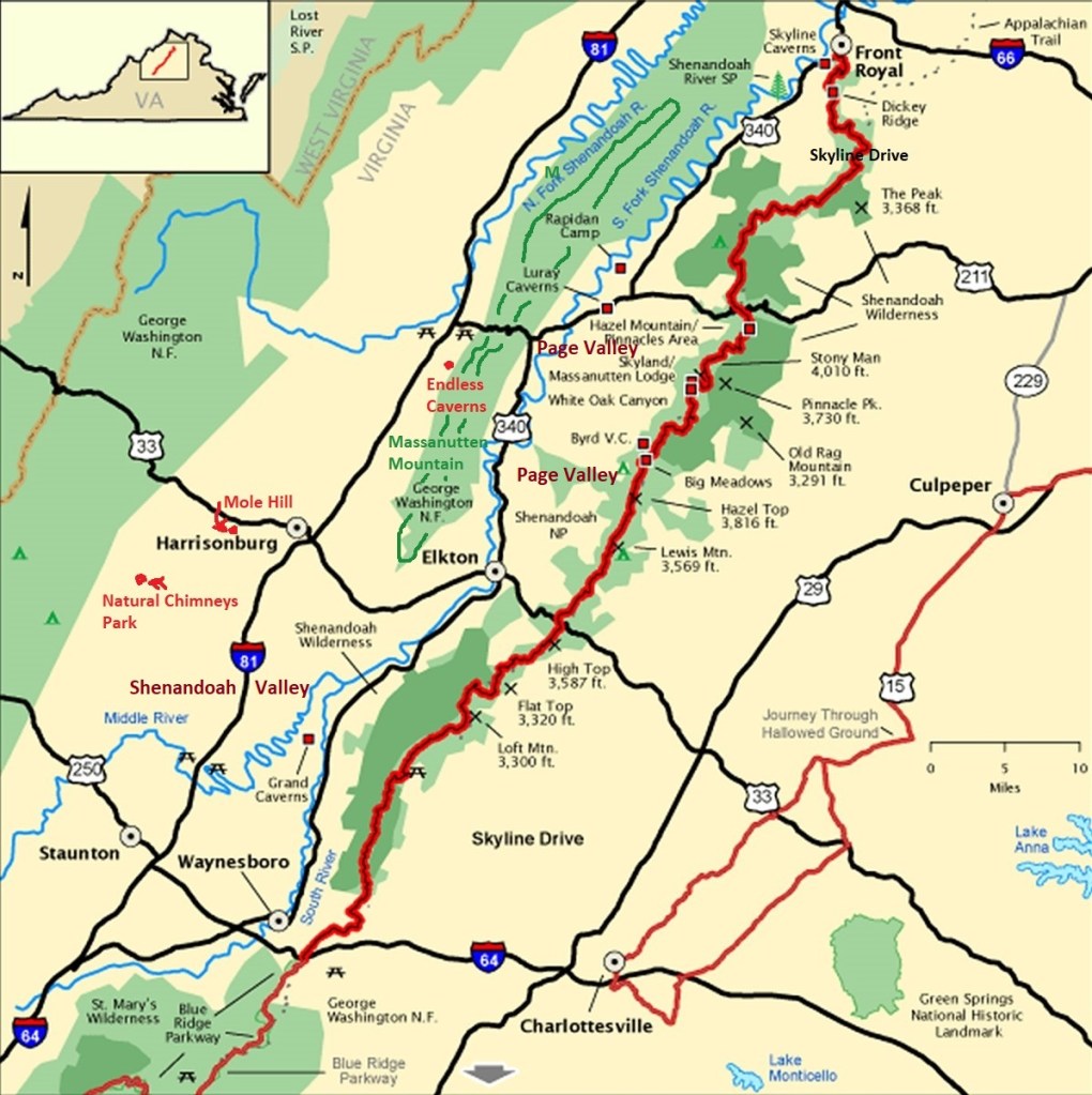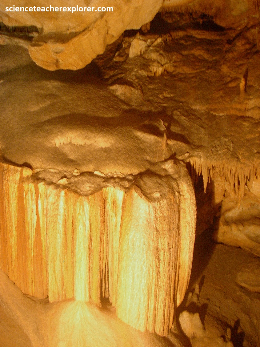 Some limestone and dolomite formations form a unique topography called karst, which is characterized by many sinkholes and a paucity of streams on the surface. Because these rock types are highly soluble, water tends to flow rapidly into the subsurface along fractures where large solution cavities, or caverns, are formed. Four commercial caves, (Skyline, Luray, Grand Caverns and Endless caverns), lie in the Shenandoah Valley close to Shenandoah National Park. I visited the last two mentioned above.