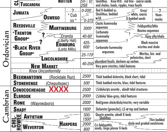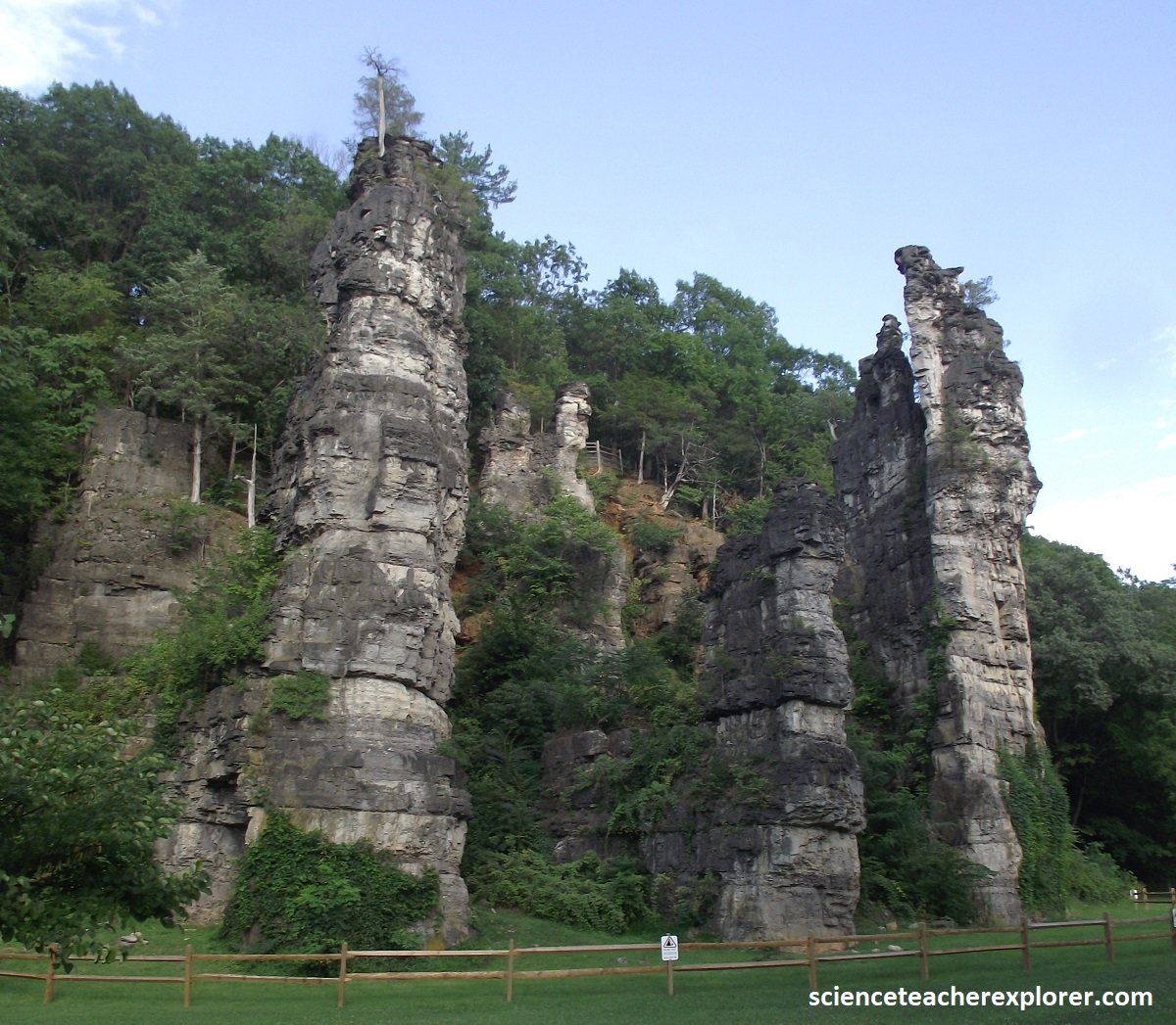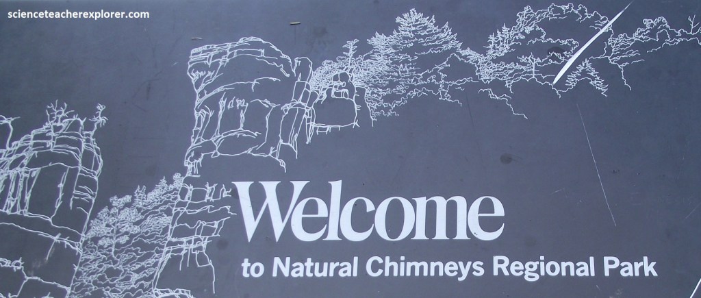 I continued to explore the Late-Cambrian Conococheage Formation by driving north on US340 to Elkton, turning left on US33 and driving to Harrisonburg. From there, I headed south on VA-42 to High Street to VA-747 (Mossy Creek Rd.). From there I turned left onto SR-747/SR-613/Mossy Creek Rd., then right onto SR-731/Natural Chimney Rd. where, at the fork, I went right onto SR-936/Natural Chimney Ln.. This brought me to a parking lot at the Natural Chimneys Park in Virginia, (pictured below).
