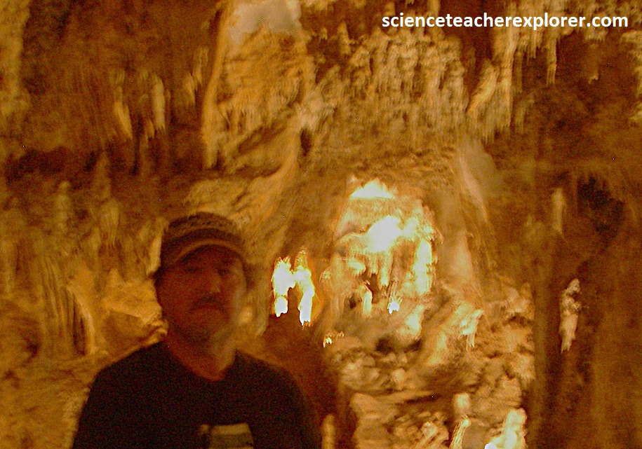 Pictured above, initially swamped with water, cavern systems can become dry when either the land is elevated or the groundwater level is lowered. Once dry, a range of cavern formations, including flowstone, stalagmites, stalactites, and soda straws, begin to ornament ceiling, walls, and floors. These form as the mineral calcium carbonate precipitates from the rainwater percolating into the underground voids. {Photos below were taken at the “Endless Caverns, Virginia in 2024, (I’m standing in the last photo that is a bit blurry).}