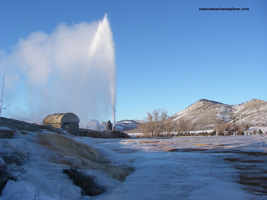 Today the city is also known as the location of the Soda Springs Geyser, which was unleashed in 1934 when “town fathers” were looking for hot water for a “hot pool” bathing attraction. Instead they drilled into a chamber of highly pressurized carbon dioxide gas and cold water and the geyser was released. After running for weeks, and flooding the downtown area, it was capped and manually released when requested as a tourist attraction. Now it is let loose every hour on the hour by a timed release valve. Pictured above, its height and volume has not decreased after many years. The water coming out of the geyser is about 70 degrees Fahrenheit, shoots 30 meters into the air.