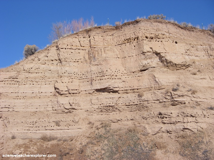 Pictured above, the Bear river deposited a huge, mostly red clay delta here where it entered Lake Bonneville. Then 14,500 years ago, it’s shoreline went down about 30 meters following the enormous discharge into the Snake River, mentioned above. From then on, Lake Bonneville gradually receded to become the Salt Lake. Bear River then had to cut through and erode it’s old delta, forming the steep sides and gullies seen above.
