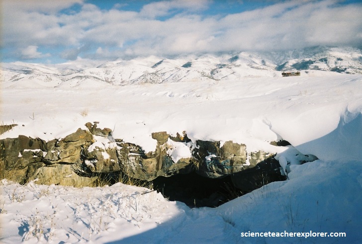 Pictured above, Just 4.8 km south of Grace, a few meters away from the highway on a little turnoff to the east labeled “Ice Cave Road,” an unassuming hole in the ground opens into a cold, dark chasm carved by molten lava 500,000 years ago. This hole in the ground is called “Niter Ice Cave”.