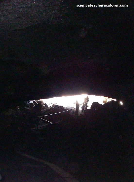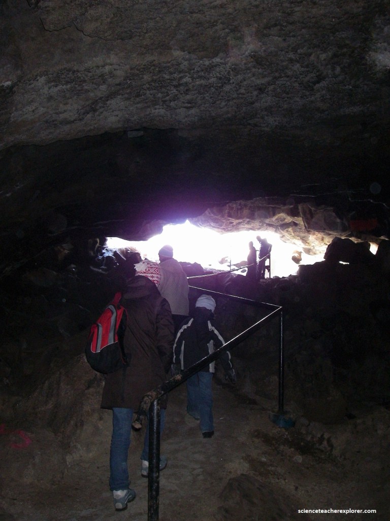 Niter Ice Cave was important to the early settlers. In 1898, John A. Dalton traveled to Blackfoot, Idaho and filed on a homestead of 160 acres. His family was delighted to find this ice cave and would send their daughter Elsie for milk, butter, and cream, stored in the cave. Mr. Dalton built the first ladder to be used in entering the cave and referred to the storage area as the window. Obviously, a feature of the cave is ice. Water collects and is frozen by cold air passing through the cave. This freezing process takes for about seven months, then gradually melts during the remainder of the year. Pictured above, a railing leads visitors down the somewhat steep and often slippery entrance.