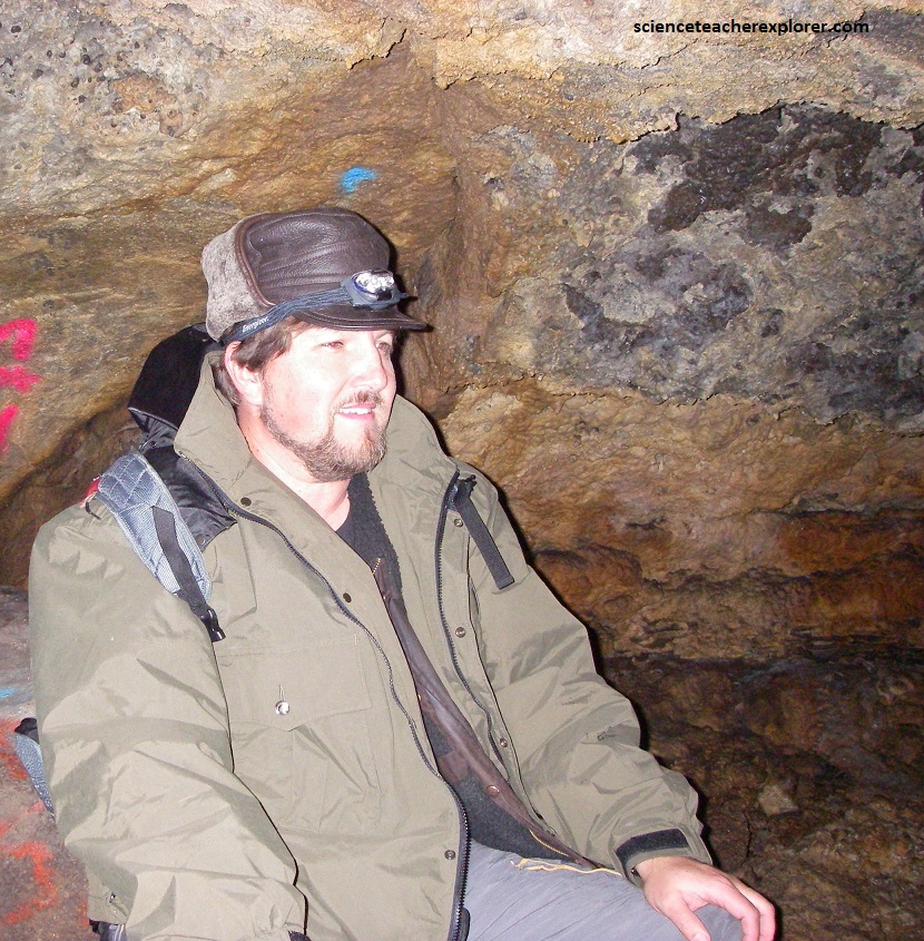 Pictured above, graffiti on the walls and an abandoned fire pit are unfortunate reminders of the cave’s local popularity, use and sometimes misuse, but further inside, nature itself splattered a metallic pattern of minerals, Sistine chapel style, across the cave’s ceiling, sparkling like fireflies in the artificial light of a headlamp.