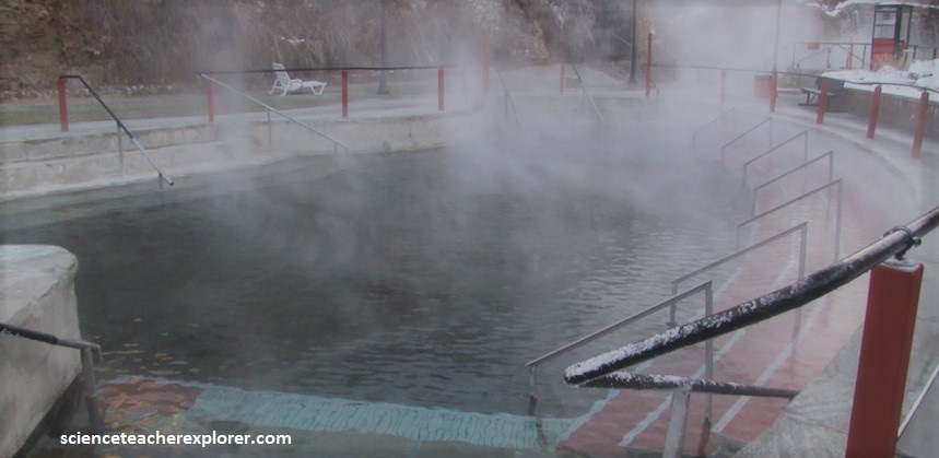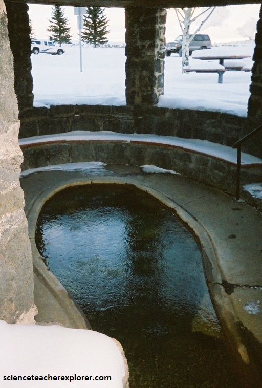 Just a 20 km west of Soda Springs is Lava Hotsprings. The Lava Hotspring system has a flow of 130 liters/second. The hot mineral water emerges from the ground at 113°F / 45°C. The mineral content of the water includes manganese, sodium, iron, calcium bicarbonate, potassium, magnesium, iron, zinc and fluoride. The Shoshone-Bannock Natives called it the “land of healing waters”. The rock content of the spring vents consist of Paleozoic quartzite and younger travertine.