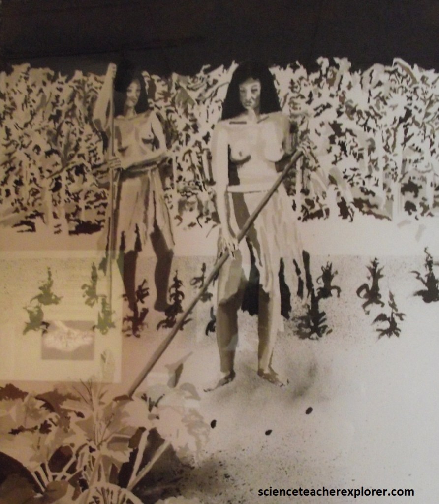 As with most communities of this time period and area, women were responsible for feeding the community at Spiro. the women, with the help of the children, would do the planting, weeding, harvesting, and general care of the crops. They also collected wild or semi-domesticated plants for food and medicines. Farming was a demanding task. Families burned and cut cane breaks and trees with stone axes to created fields near the river, and used hoes of stone and bone to prepare the fields for planting. Woman harvested grain crops with sickles made from the lower jaw of a deer attached to a wooden handle. Crops include corn, beans, squash, sunflower, may-grass, and chenopodia. Wild plants were also a food source.
