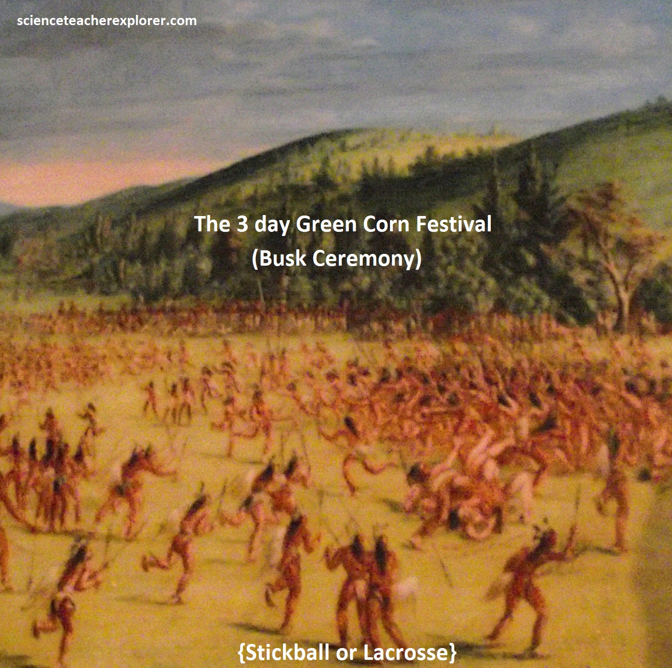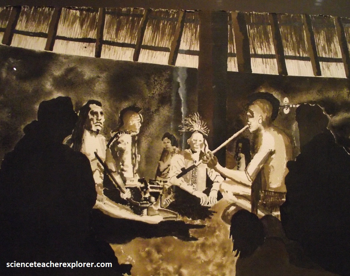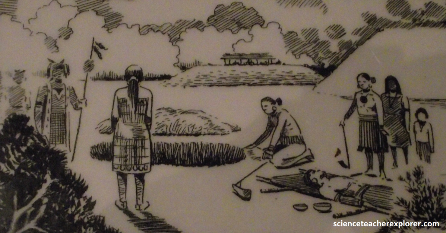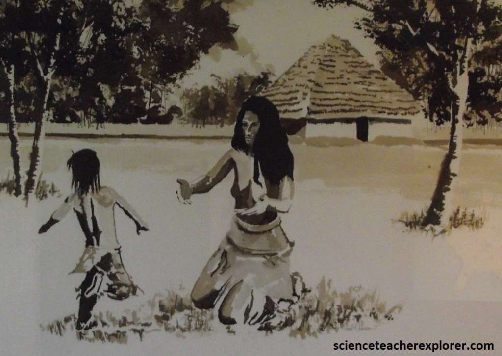 Life revolved around the seasons. In the spring, prior to the Vernal Equinox, the women would prepare the fields and then plant after the leaders performed spring rituals and approved the planting time. In September, the most important celebration took place at harvest with Busk or Green Corn Celebration near the Autumnal Equinox. As crops were harvested and wild foods were collected, they would be eaten or preserved by “drying or smoking”. Root crops would be hung from the ceiling in the house and grains would be stored in large pottery jars for future use.