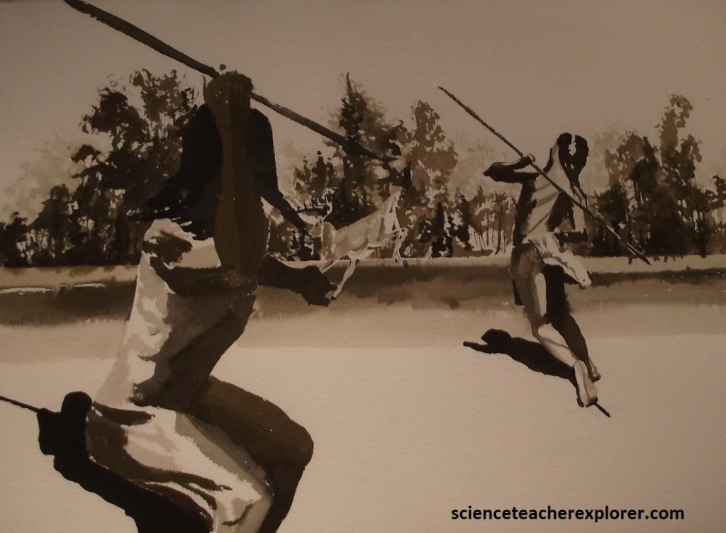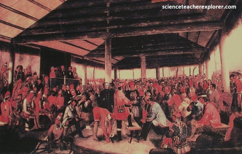 An interest in America’s Native Indian heritage certainly enriches a visit to this corner of Oklahoma. The Cherokees, who had farmed and hunted in the southern Appalachians for centuries, were forced by the government to relocated here n the 1830s. On their way thousands succumbed to sickness and cold along a trek that has com to be called the “Trail of Tears”. Members of the tribes were shackled to wagons while villages were ransacked and burned to discourage resistance. The harsh treatment, grueling pace, and insufficient supplies throughout the forced march killed thousands of indigenous peoples. Yet those who survived gallantly began their new lives, at home once again in a soothing, forested terrain where hope could be reborn with a number of other relocated native-tribes in the Oklahoma Territory, (imaged below). {Imaged below, taken from an interpretive sign on-site}
