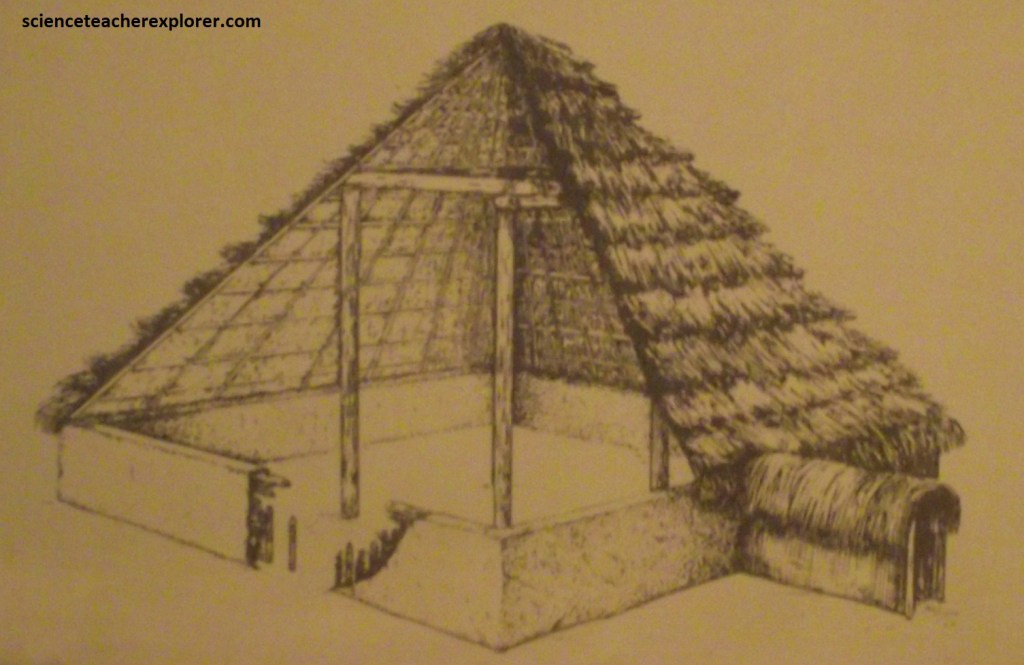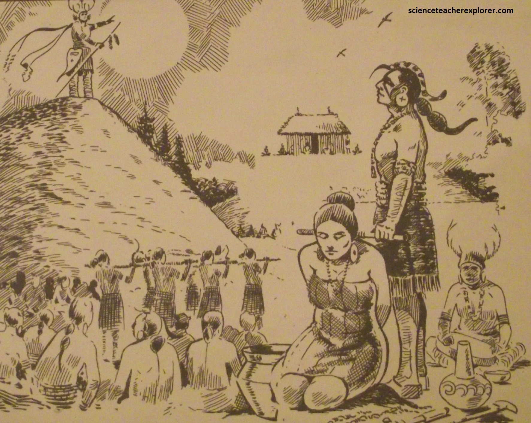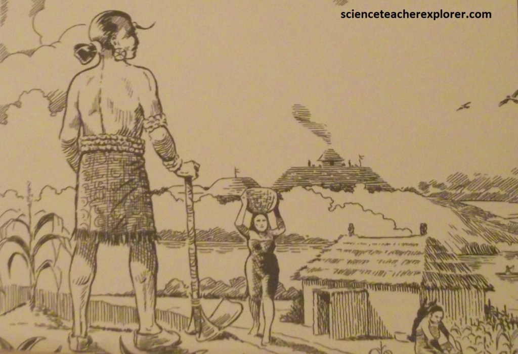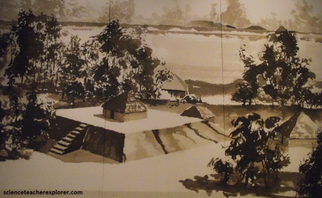 The houses were built, used until the leader’s death, and then destroyed, often by burning. Basket-loads of dirt were carried up from pits along the river and used to cover the old house area with one to two feet of earth. The mounded earth was then flattened on top and sloped on the sides, so it looked like a very small cut-off pyramid. Occasionally the mound was left vacant, but usually the next leader’s home was built on the flattened area. As leaders lived and died, the mound grew larger.