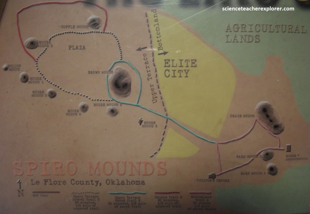 Twelve mounds were built on the 150 acre site: a leaders burial mound known as Craig Mound, two temple mounds, and nine house mounds. These mounds are in two main groups the Bottomland and the Upper Terrace. The Bottomland mounds are Ward Mound 1 and 2 and Craig Mound. They are located on the Arkansas river floodplain just to the east of the Visitor Center. The Upper Terrace mounds are on the terrace overlooking the river bottoms to the northwest of the Visitor Center. Surrounding the ceremonial mounds was a city made up of the swellings of farmers and craftsmen, and beyond these were agricultural lands on the Arkansas River bottoms that sustained all of Spiro.