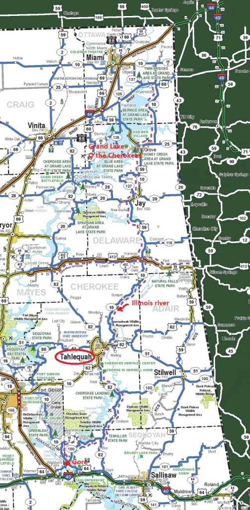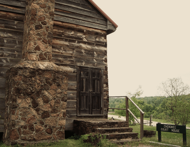 Several years before the march along the “Trail of Tears”, some members of the Cherokee tribe, known as the Western Cherokees, were already living in present-day Oklahoma. Their government, (a democracy that took the U.S. Constitution as it’s model), was centered about 5 km east of Gore, where a re-creation of the 1829 Cherokee Courthouse can be seen, (Pictured below).
