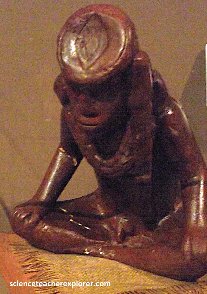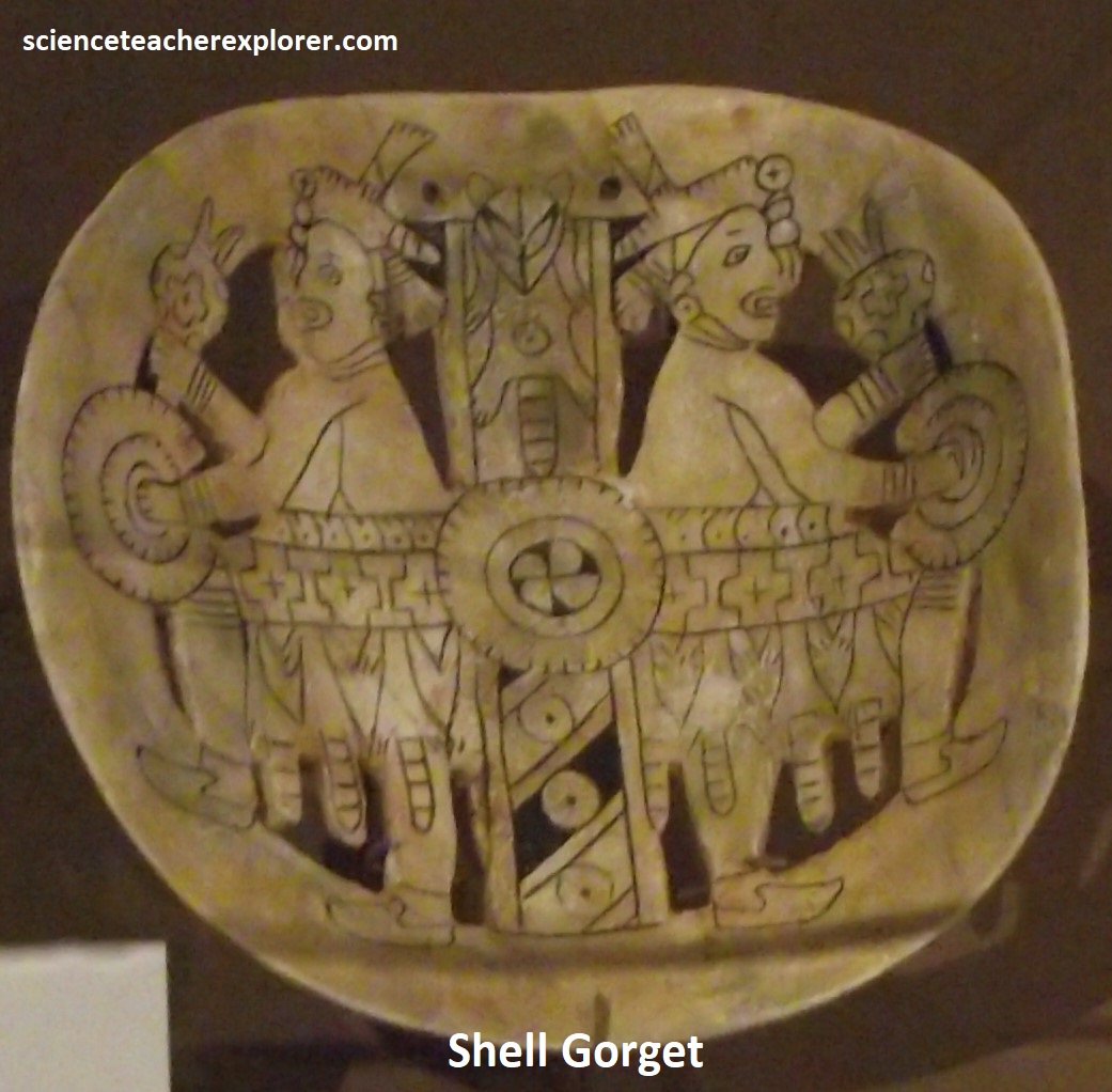 The sun, when viewed from the top of the temple mound on these days, would set over one of the three mounds and the house of the primary leader. For the elite, this visual link of the leader’s spiritual power to the sun was a powerful ceremonial event. The main Temple mound, (Brown Mound), was the center of Spiro’s spiritual, political, and judicial life. The symbol of the sun, the First Fire, burned continuously in the Temple. The Temple was the main focus of the society’s important decisions regarding planting and harvesting times, judicial issues, and spiritual healings. {Photos below were taken in the visitor’s center at the Spiro Mounds Site, Oklahoma 2024.}