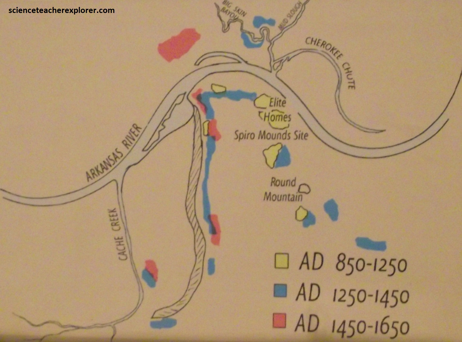 The Spiro area was originally settled around 800 A.D. along the Arkansas River. Over the next 300 years, this community grew to a population between 5,000 and 10,000. Today the site is peaceful and clean, but 1,000 years ago this was a loud, bustling seat of government, agriculture, trade and religion. Thousands of adults, children, and even dogs run around attending to their business amid a constant smoky haze from the home fires as well as the burning of fields. The Arkansas River bustled with activity. On a typical day on the river canoes floated past, filled with people and trade goods, people filled water containers, checked traps and wiers, fished and bathed.