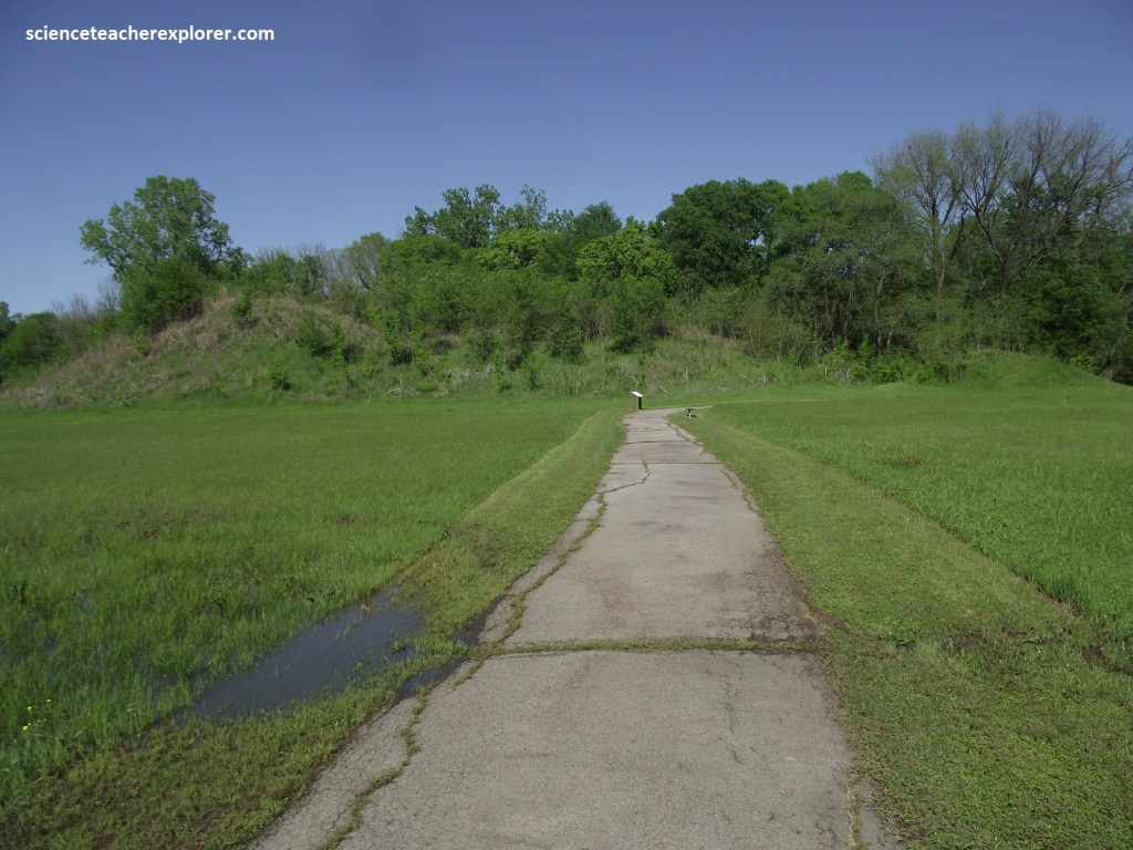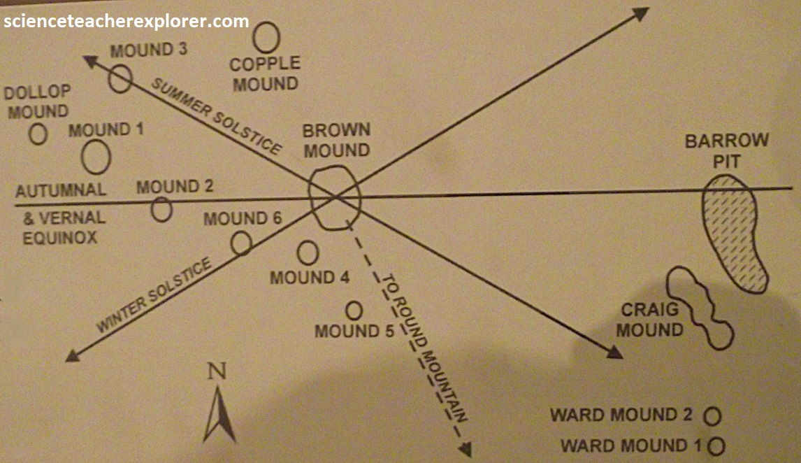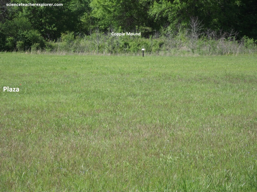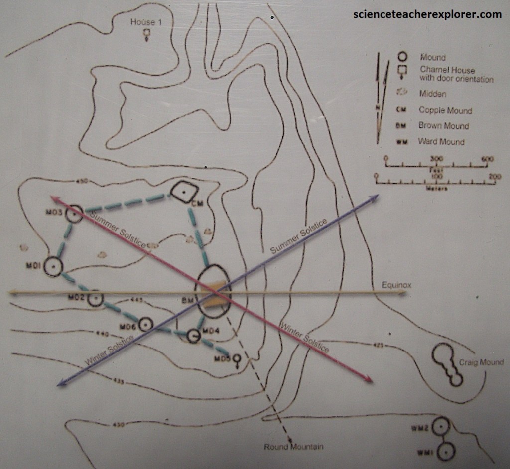 Imaged above, Brown Mound is located at the eastern edge of the Plaza. This mound and three of the house mounds were constructed so that they were in alignment with the sunsets of the various solstices and equinoxes during the year. Summer Solstice (House Mound 3), the Winter solstice (House Mound 6), and the Vernal and Autumnal Equinoxes (house Mound 2). {The lower image below were taken from an interpretive sign on-site}