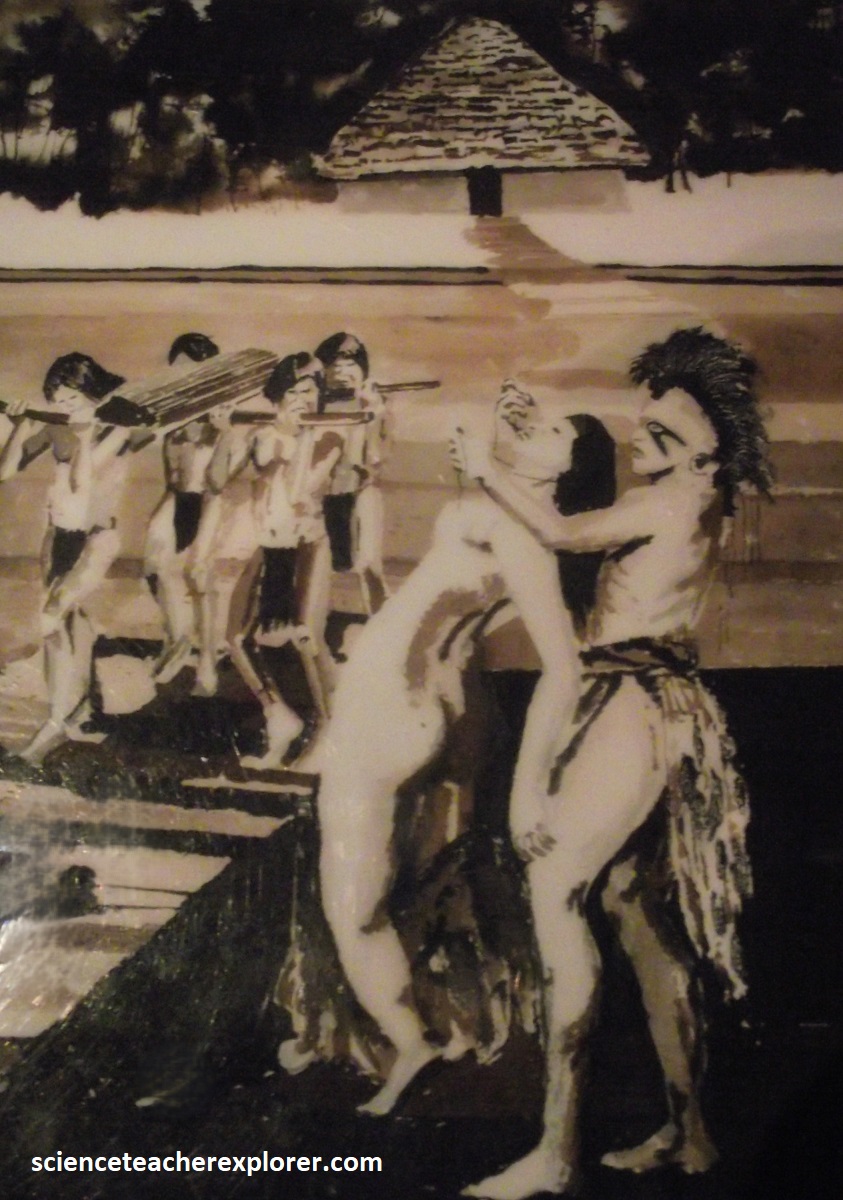 The most elaborate burial was that of “The Great Sun”, the principal leader of the Spiro people. The body was cleaned and dressed in ceremonial garb. Priests then laid the body on a litter of cedar poles surrounded with symbols of power. Imaged below, when the funeral day finally arrived, crowds of people lined the pathway from the Brown-Temple Mound to Craig Mound. Several warriors carried the litter along the route to lay it on the surface of Craig Mound. Close to the burial mound, the spouse and servants of “The Great Sun” knelt and members of the warrior society stood behind. As the body of “The Great Sun” passed by, the spouse and servants were beheaded or garroted (ceremonially strangled) and the bodies placed near the letter on the Craig Mound. The burial was then covered with 1-6m of dirt. (Images below of “The Great Sun” burial were taken from interpretive signs on-site).