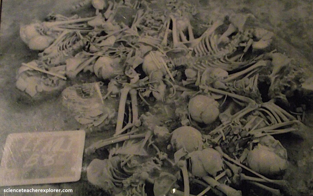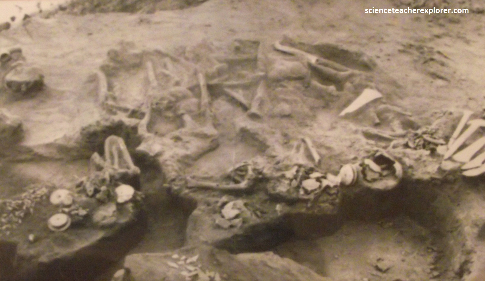 The most common type of burial at Craig Mound was that of mid-level leaders and elders. The bodies were prepared in one of two ways: stripped of flesh and the bones stored in baskets of buried in cemeteries in the home area and dug up when a major group burial at the Craig Mound occurred. Sometimes the remains of as many as 100 people were placed on the mound and covered with a thick layer of packed dirt. (Images below of group burials were taken from interpretive signs on-site)