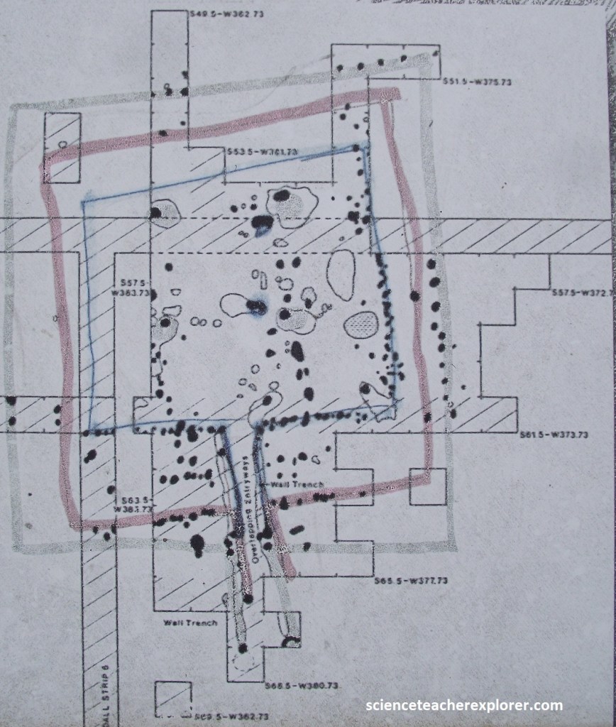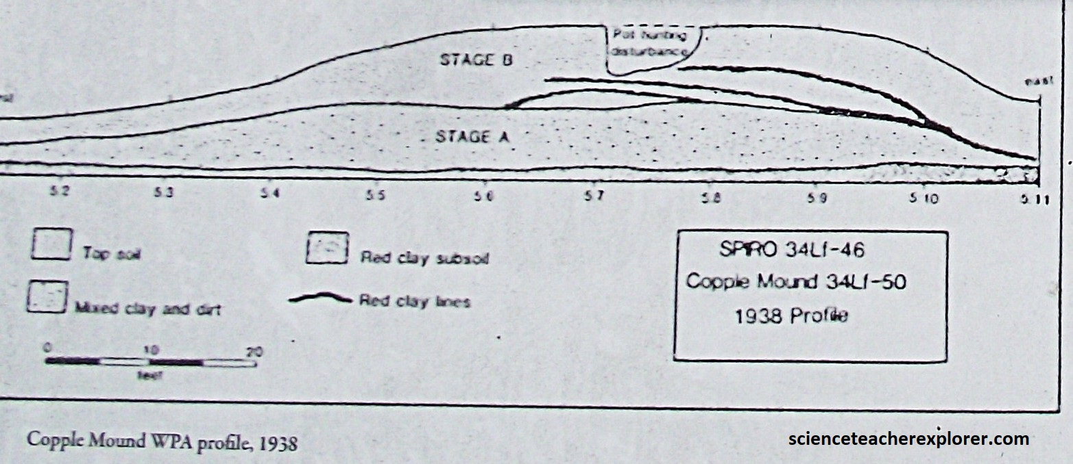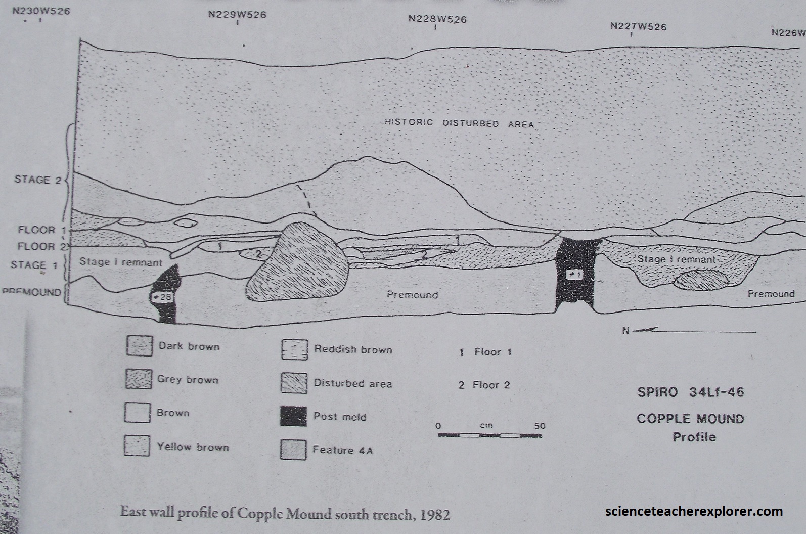 Pictured above, Copple Mound was partially excavated in 1938 and again in 1982, both times by the university of Oklahoma. Pictured below, the excavation in 1982 revealed a very complex series of constructions beginning with two houses and progressing with additional mound building done over time. A date of 1180 A.D. was obtained from a fire hearth in one of the house indicating Copple Mound was one of the last mounds built at the Spiro Mounds site. The later use of the mound was probably as a second temple mound. {Images below were found on an interpretation sign on-site}.