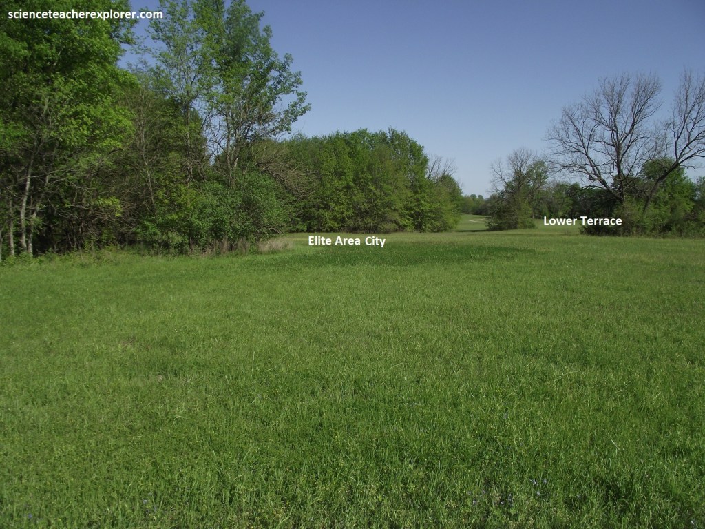 The incredible wealth of art and objects buried with the leaders made the Spiro Mounds Complex famous. Like a town square, the mounds were the site of political, religious, and social activities. Some were foundations for the homes of the elite, or spiritual leaders. Others were for the main political/religious buildings (Temples), and one mound was for the burial of the leaders Sprawling neighborhoods surrounded this city center where farmers, hunters, craftsmen, and their families lived, and most home were built on terraces overlooking the Arkansas River. The upper terrace was a dense Oak-Hickory forest with open grasslands maintained for the men to hunt, (imaged below).