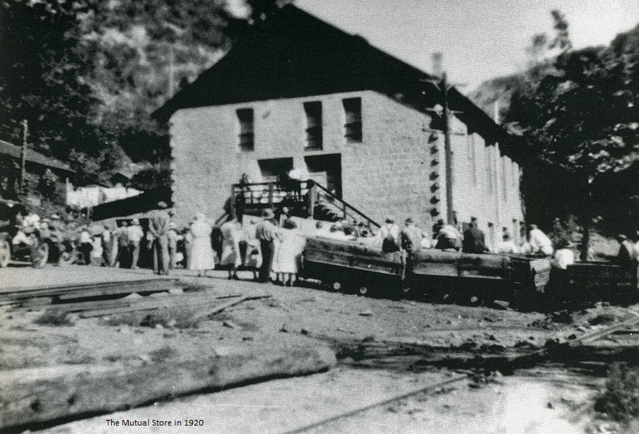 Pictured above is a large company store for the community of Mutual. Mutual was known for its pretty and well-kept homes, (pictured below). Unlike most mining camps of the era, the Mutual Store was independently owned and operated by John Columbo. The two-story stone building became the focal point of community activity with an amusement hall on the second floor. This space served several uses, including a union hall, movie theater, dance floor, and boxing arena. It also had a pool hall, saloon, and a doctor’s office.