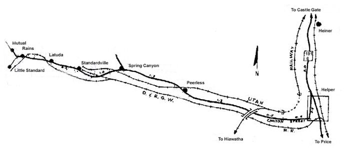 Pictured above, at the mouth of Spring Canyon, the Peerless Mine was established between 1916 and 1918. At its peak, Peerless employed nearly 150 men. The picture above shows the Peerless tipple with several company homes visible on the left and the school on the right. The two sets of railroad tracks belong to the Denver and Rio Grande Western and the Utah Railway.