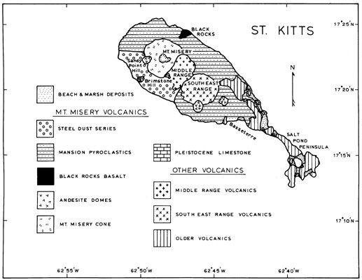 The sharp contrast in both the topography and the vegetation from the north of the island is probably due in part due to the older age of the rocks and the lower annual rainfall in the south. The capital of St. Kitts is Basseterre and it is located 12 km south-east of the summit of Mt. Misery.