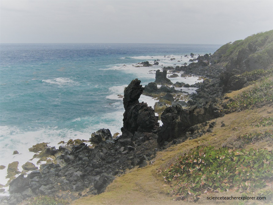 If a lava dome developed in the crater of Mt. Misery it would stay within the confines of the crater until it reached the height of the crater walls and then either collapse to form pyroclastic flows or it may continue to passively erupt lava that would flow down the flanks of the volcano towards the sea to form lava flows like the one we see at the “Black Rocks” (pictured above) on the north-east of the Mount Misery crater.