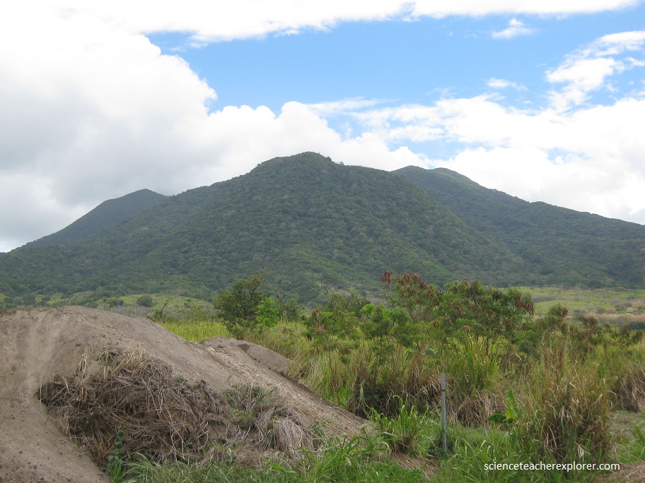 Mt. Misery has a summit crater ~900 m wide and 244 m deep. The summit of Mt. Misery exposes remnant lava flows or domes but the most common deposits identified on the lower flanks of Mt. Misery are pyroclastic deposits. Cliff exposures along the coastline reveal 10-15 m thick successions of pyroclastic deposits (fall, flow and surge deposits), debris avalanche deposits and lahar deposits. Lava domes are prominent on the flanks of the volcano at Brimstone Hill near John Newton’s house/museum. Active fumaroles occur in the crater of Mt. Misery, along the coast below Brimstone Hill and along the base of Brimstone Hill. I was unable to visit these fumaroles.