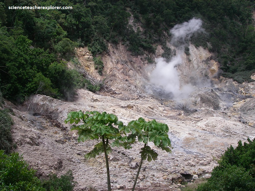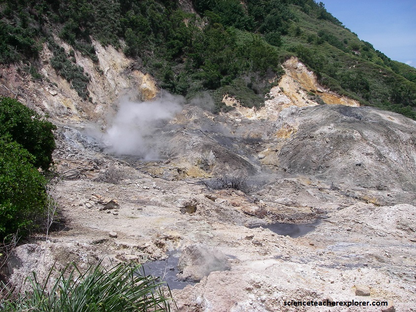 Pictured above, the streams that feed the Upper and Lower Diamond Falls originate at Sulphur Springs, which is touted as the world’s only “drive-in” volcano. The road leads into the remains of Mount Soufriere’s volcanic crater near the edge of the volcanic activity.