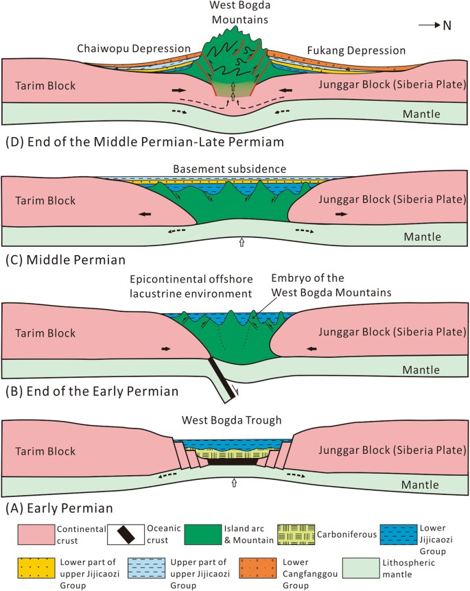 At the end of the Early Permian, the West Bogda Trough was closed and an island arc was formed. The west Bogda area became an inherited catchment area, and developed a widespread shallow, deep and then shallow lacustrine succession during the Mid-Permian. At the end of the Mid-Permian, strong intracontinental collision caused the initial uplift of the West Bogda Mountains, (imaged below).