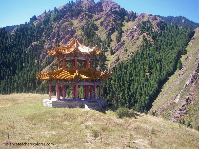 Centered on Tianchi Lake, Tianshan Tianchi National Park coverd four natural landscape zones, (snow-covered mountain, glacier and alpine lake, Thick forest, and a vast grassland). Picture below, a Taoist or Buddha site on our trek.