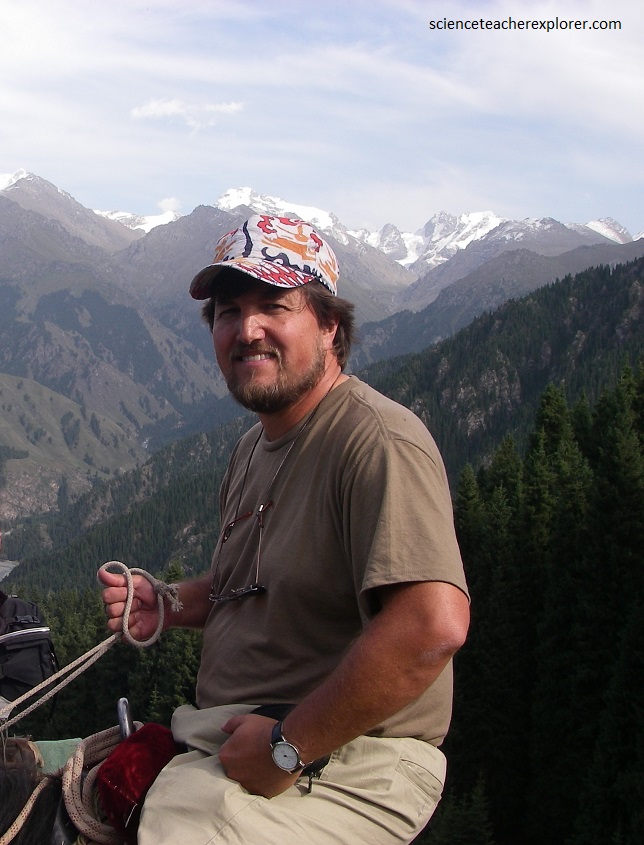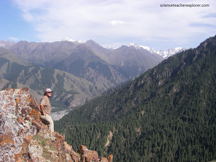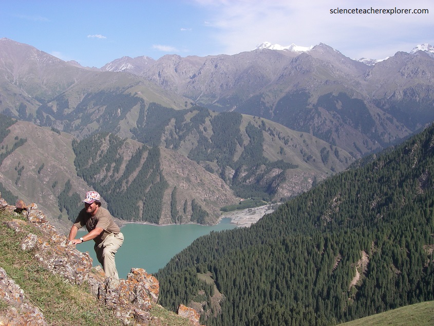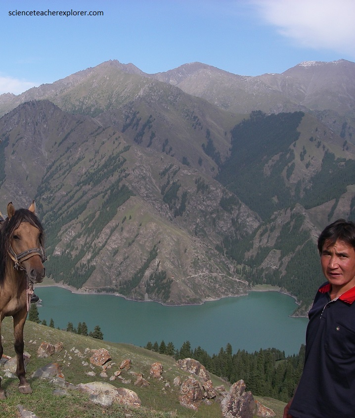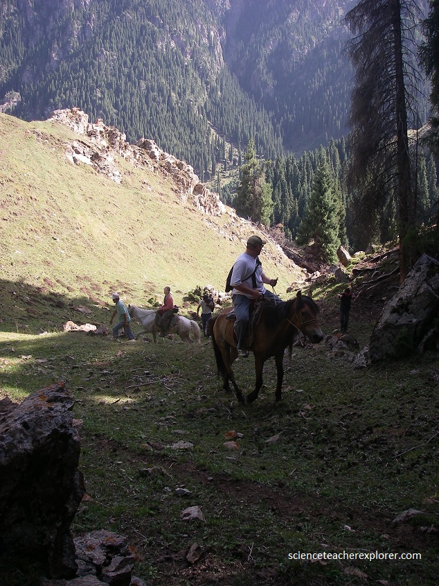 Pictured below, the next morning, my trekking crew saddled some of the Mongol Horses and rode to the top of a ridge to get a view of Bogda Peak. The mountains of the Tien Shan are composed in the main of crystalline and sedimentary rocks of the Paleozoic Era (i.e., about 540–250 million years ago).