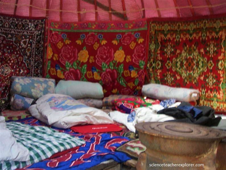 The Kazakhs are a mixed ethnic group with both Asian and Caucasian features. Traditionally, the Kazakh people are nomadic, tribal shepherds and ranchers of cattle, sheep, goats, and horses. They traditionally live in Yurts. Our Yurt was beautiful inside, with lots of brightly colored and decorated rugs, quilts and wall hangings, (pictured below).