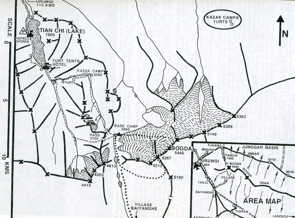Bogda Peak is the highest mountain in the Bogda Shan range, in the eastern Tien Shan mountains, China, at 5,445 m. Bogda Peak is a challenging climb due to its steep relief. Its sides slope at angles of between 70° and 80°. It was first climbed in 1981 by an 11-person team from Kyoto.