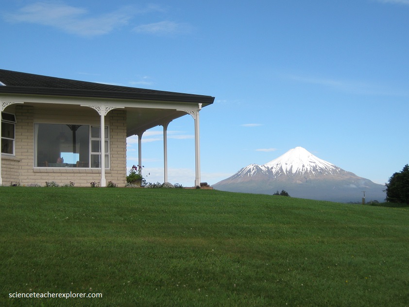 Eventually, we make it to Stratford. Named after Shakespeare’s birthplace, the streets of Stratford reflect the Great Bard’s characters. Renowned as the gateway to Egmont National Park, Stratford is the home of Becky’s Aunt Jeannie. Their house had a spectacular view of Mount Egmont.