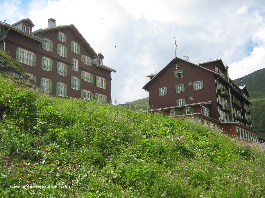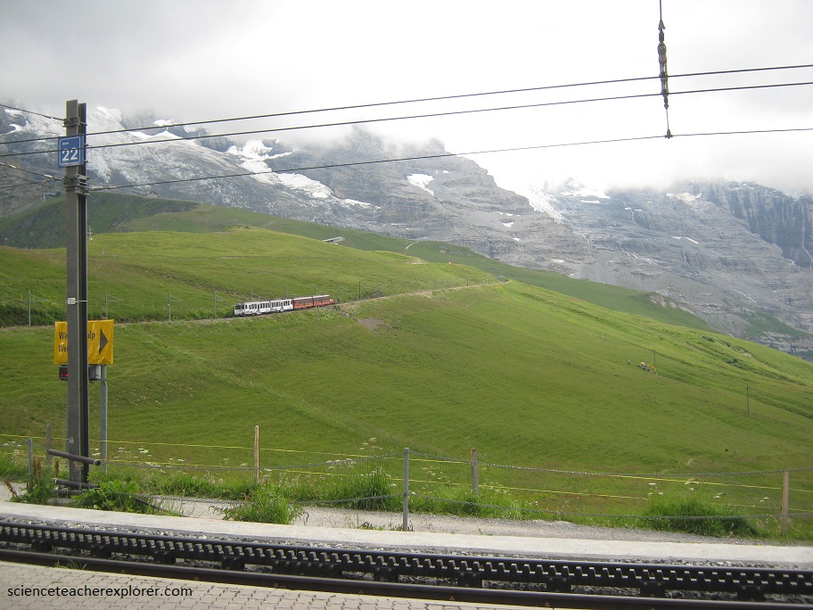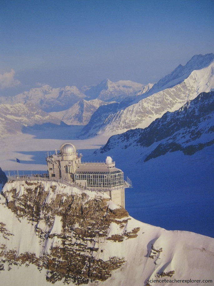 Once on top of the Eiger, I get a good look at two peaks called Jungfrau and Monch. I also get a great look of the beginnings of the Aletsch Glacier. Pictured below, I’m standing in front of Jungfrau peak at the Jungfrau Meteorological/Climatological Research Station.