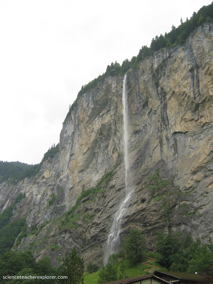 From Grindelwald, I continued my trek to the Staubback Fall, (pictured below). The Staubback Fall is a waterfall, located just west above Lauterbrunnen. The waterfall drops 974 ft. from a hanging valley that ends in overhanging cliffs above the Weisse Lütschine. The stream, on reaching the verge of the rocky walls of the valley, forms a cascade so high that it is almost lost in spray before it reaches the level of the valley. After rain, and early in the season when fed by the melting snows, the Staubbach Fall is a very striking object. The force of the stream above the fall at such times is sufficient to carry the water clear of the precipice, and the whole mass descends in a condition of liquid dust, between spray and cloud, that sways to-and-fro with the gentlest breeze. In a dry summer, when the supply of water is much reduced, the effect is comparatively insignificant.