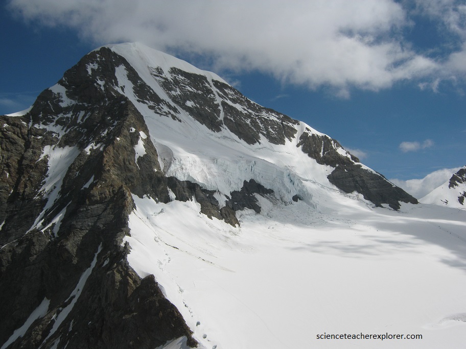 The Jungfrau-Aletsch-Bietschorn region, location in the south-central Swiss Alps, is a stunningly beautiful region. A rich coalition of geological and glacial processes have combined to produce this extraordinary landscape. The complex rock formations here, are the result of over-thrusting and folding rock layers between 20-40 million years ago, and have subsequently been exposed by the action of large glaciers. The region covers 133,400 acres and boast heights ranging between 3000 ft. and 14,000 ft. A total of nine peaks exceed 13,100 ft. in height. I took a train that tunneled through to Eiger, to get to the top, (pictured below).