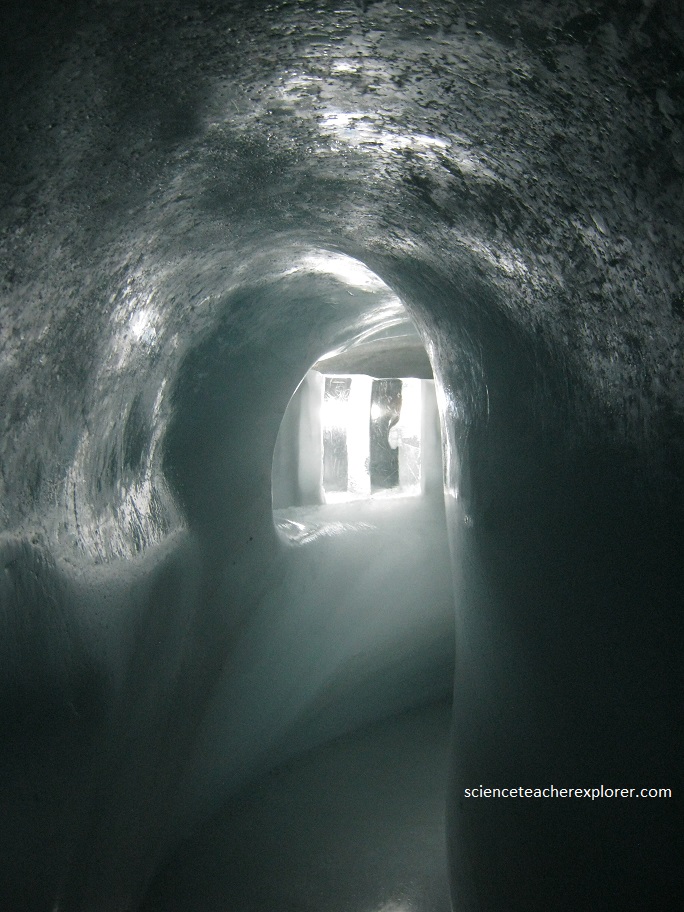 Today’s research focuses on environmental and climate science, meteorology, radiation balance, glaciology and cosmic rays. Pictured is a tunnel that goes through the glacier to get from building to building.