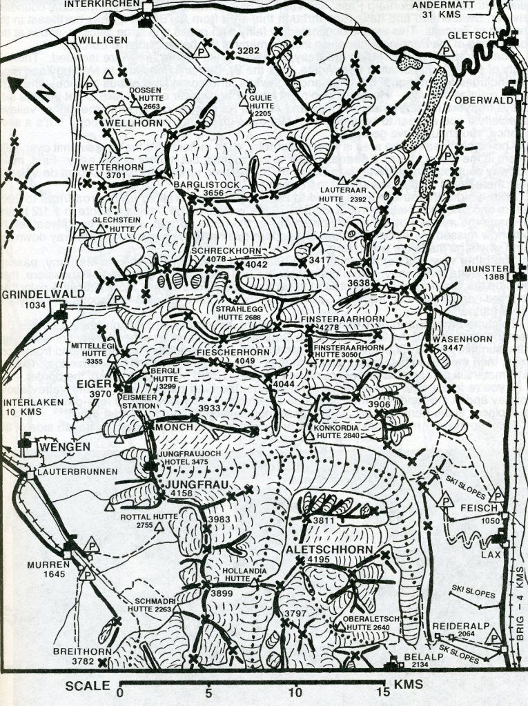 The Eiger is a 13,015 ft. mountain of the Alps, overlooking Grindelwald and Lauterbrunnen in the Bernese Oberland of Switzerland, just north of the main watershed and border with Valais.