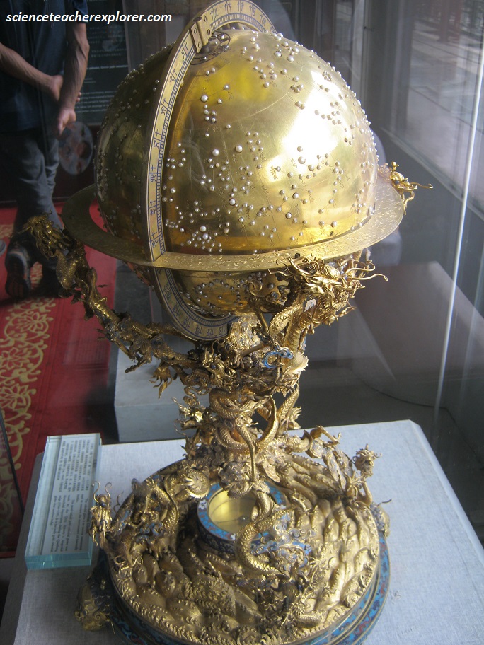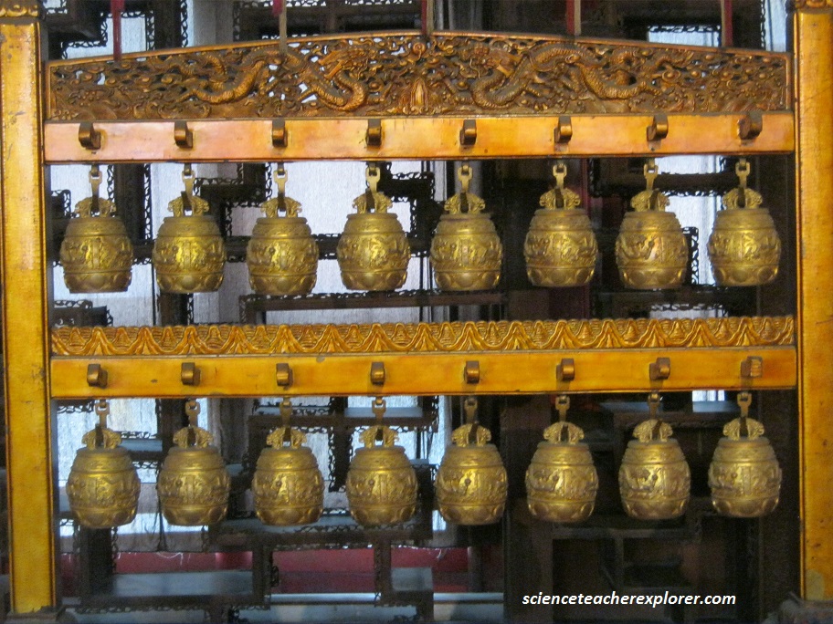 Pictured above, this set of bells was cast in 1791 (fifty-fifth year of Qianlong), required 13,600 gold taels (Qing unit of weight). The eight yin bells and eight yang bells all are the same size and shape but have walls of varying thickness to produce different pitches. The thickest one, ying bell, weights 14,317 g and produces the highest note; the thinnest one, Beigize, weights 4,703 g and produces the lowest note. Nearby, the stone chimes are made of green jade and adorned with gold-traced dragon design on the both sides.
