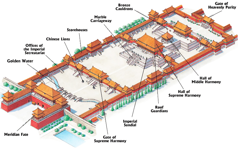 Farther north lies the Inner Court, which contains the three halls that composed the imperial living quarters, (The Palace of Heavenly Purity, the Palace of Tranquil Longevity, and the Hall of Union).