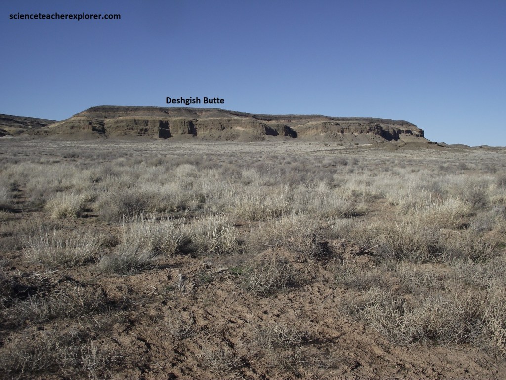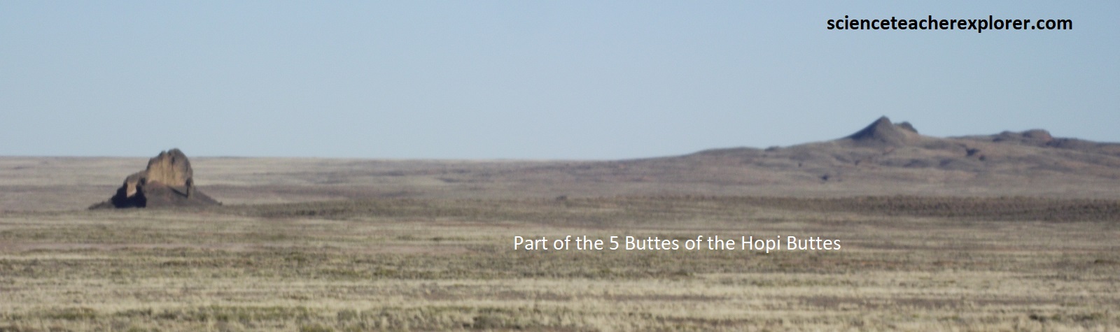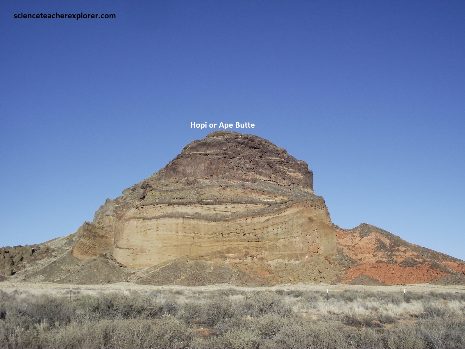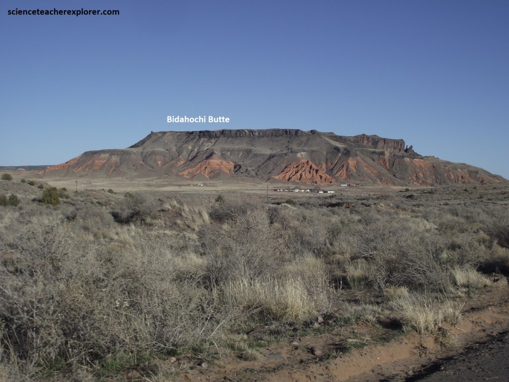 The diatremes were drilled through the reddish siltstone, sandstone, and shale of the Bidahochi Formation, which then covered the area. This unit was deposited either in one large lake or in several shallow and ephemeral ones. Pictured below, on the right-side of Bidahochi Butte, you can see the Bidahochi Formation as reddish outcrops on the flanks of the butte. The lava cap of the butte mark the top of the formation. The Bidahochi Formation is poorly consolidated and prone to sliding, producing the landslide apron that surround it. This is common in most of the surrounding Hopi Buttes. Note that the basalt, (lava), above the formation, together with layers of volcanic tuff within it, bracket the age of the Bidahochi between about 14-7 million years. Erosion since then has lowered the landscape valley weveral hundred meters to it’s present level.