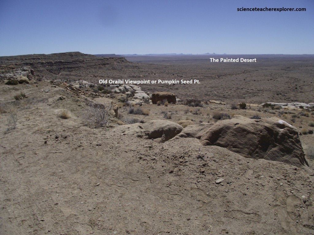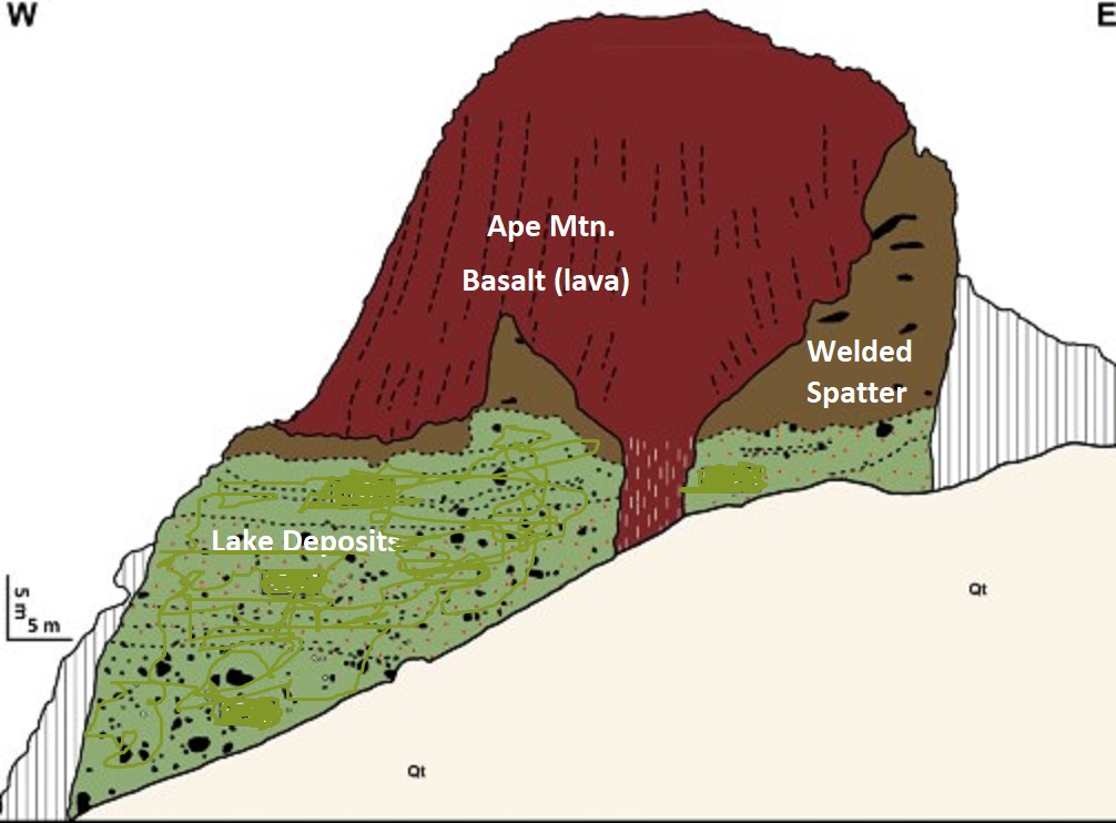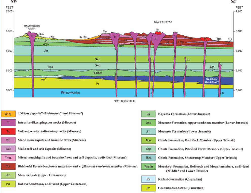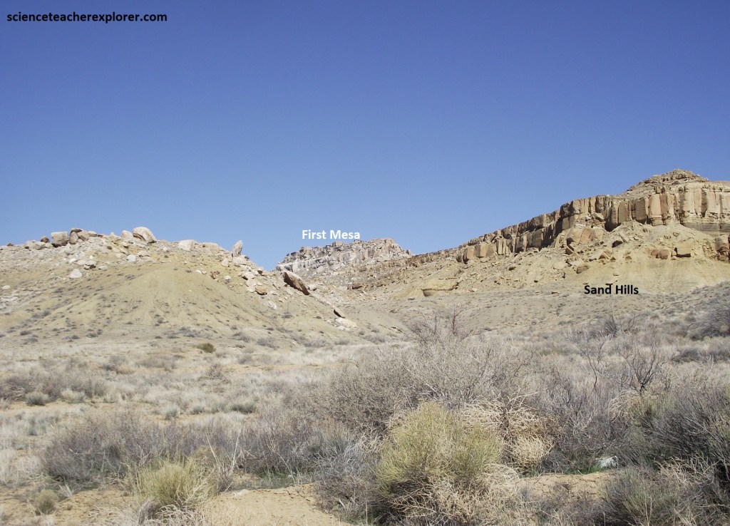 The diatremes were drilled through the reddish siltstone, sandstone, and shale of the Bidahochi Formation, which then covered the area. This unit was deposited either in one large lake or in several shallow and ephemeral ones. Pictured below, on the right-side of Bidahochi Butte, you can see the Bidahochi Formation as reddish outcrops on the flanks of the butte. The lava cap of the butte mark the top of the formation. The Bidahochi Formation is poorly consolidated and prone to sliding, producing the landslide apron that surround it. This is common in most of the surrounding Hopi Buttes. Note that the basalt, (lava), above the formation, together with layers of volcanic tuff within it, bracket the age of the Bidahochi between about 14-7 million years. Erosion since then has lowered the landscape valley weveral hundred meters to it’s present level.