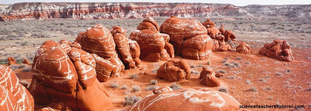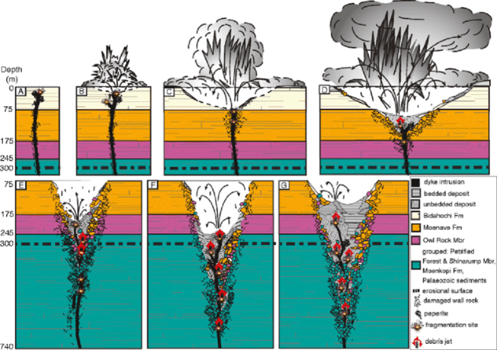 Formed between 8.5-6 million years ago, the Hopi Butte were not typical volcanoes. the eruptions were violent, yet they did not form the usual volcanic cones. The Hopi Buttes formed when rising magma encountered the saturated lakebeds of the Bidahochi Formation, causing water to flash into steam. Steam-driven explosions blew out v-shaped vents, called diatremes, topped by shallow circular craters, called maars. Diatremes is a greek word meaning “object that cuts across”. These v-shaped cavities were drilled out by gas charged magma escaping at a great velocity in explosive eruptions. The gas is water vapor produced when the magma vaporizes groundwater.