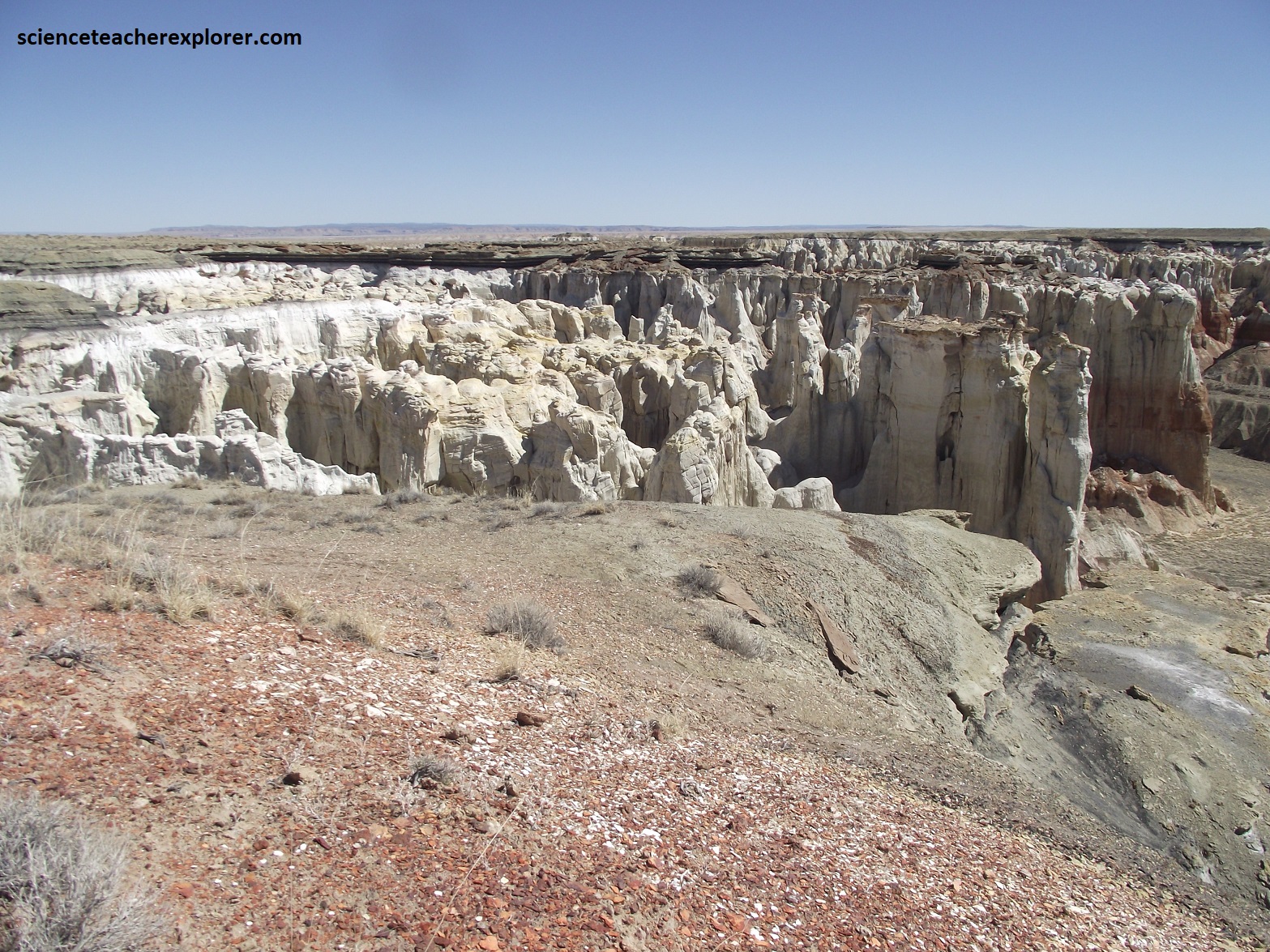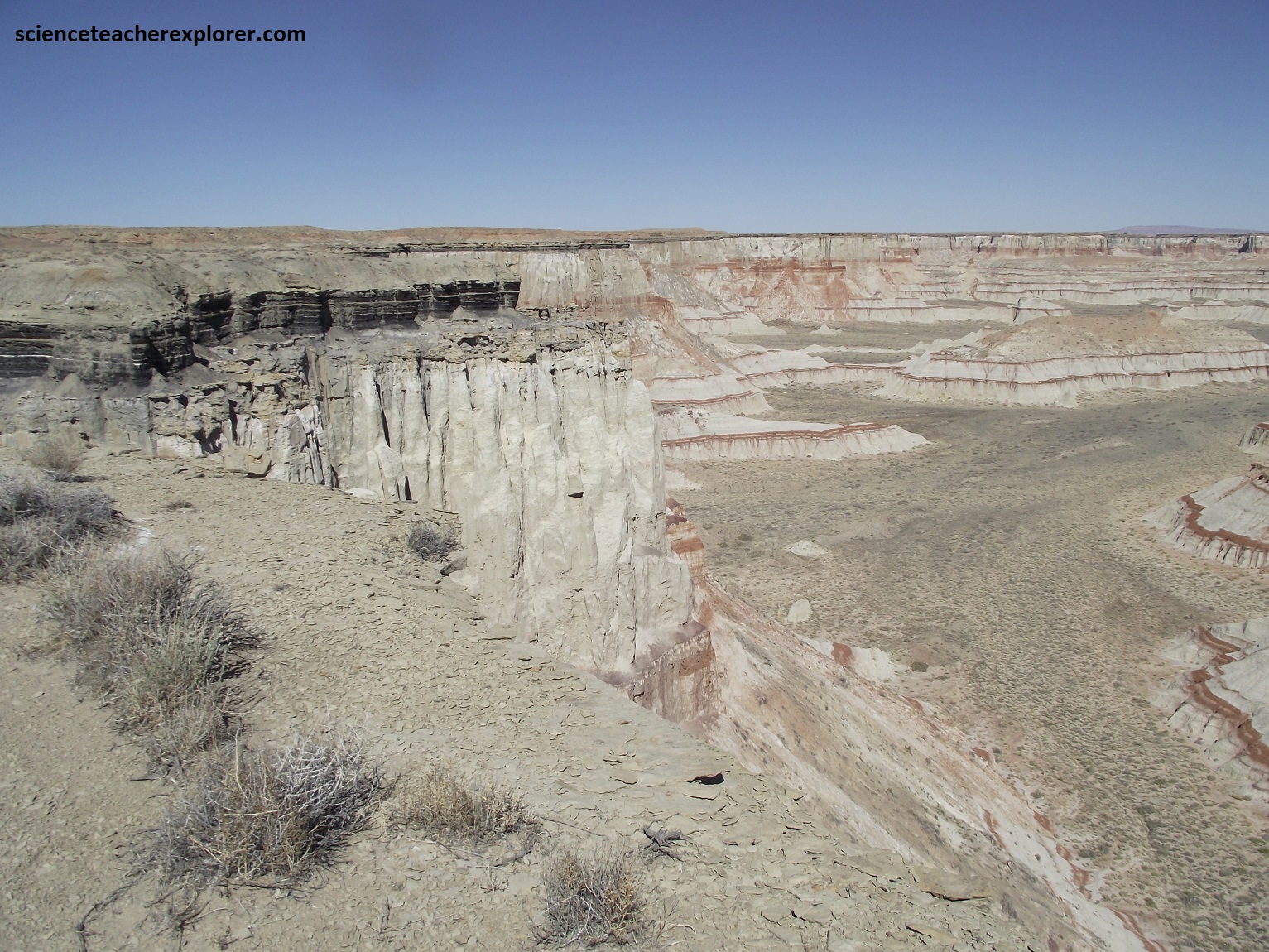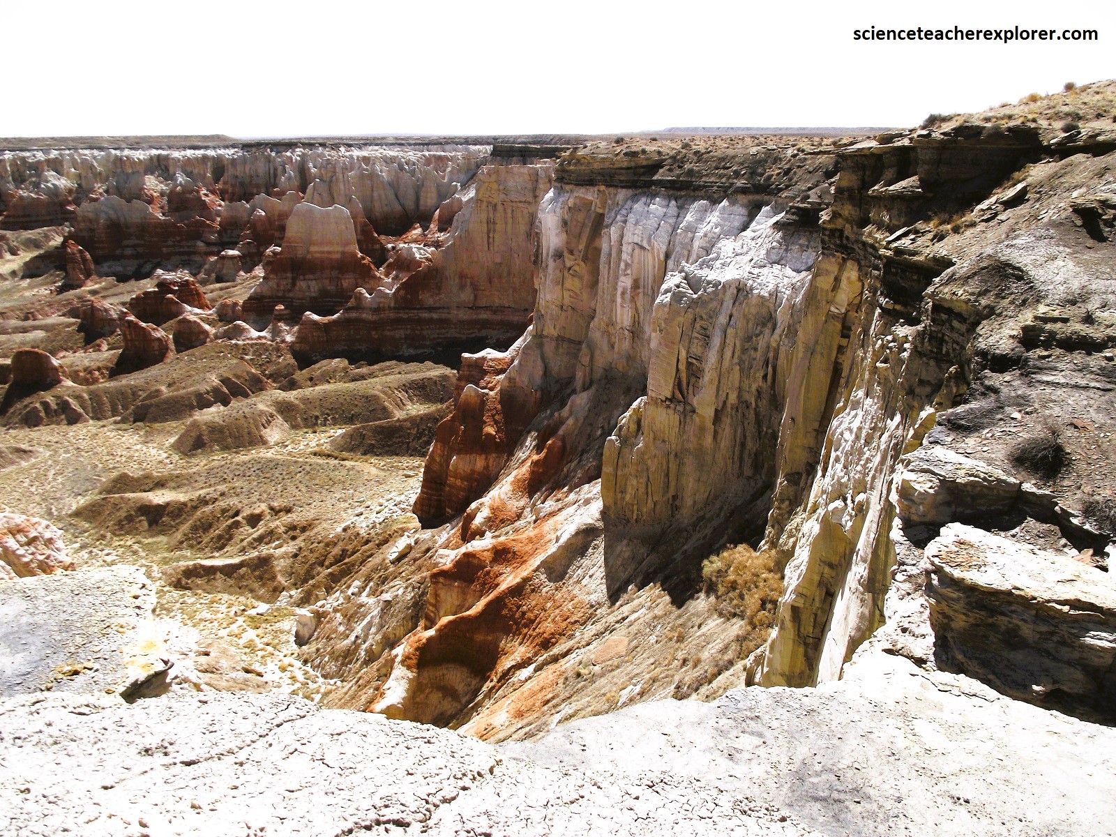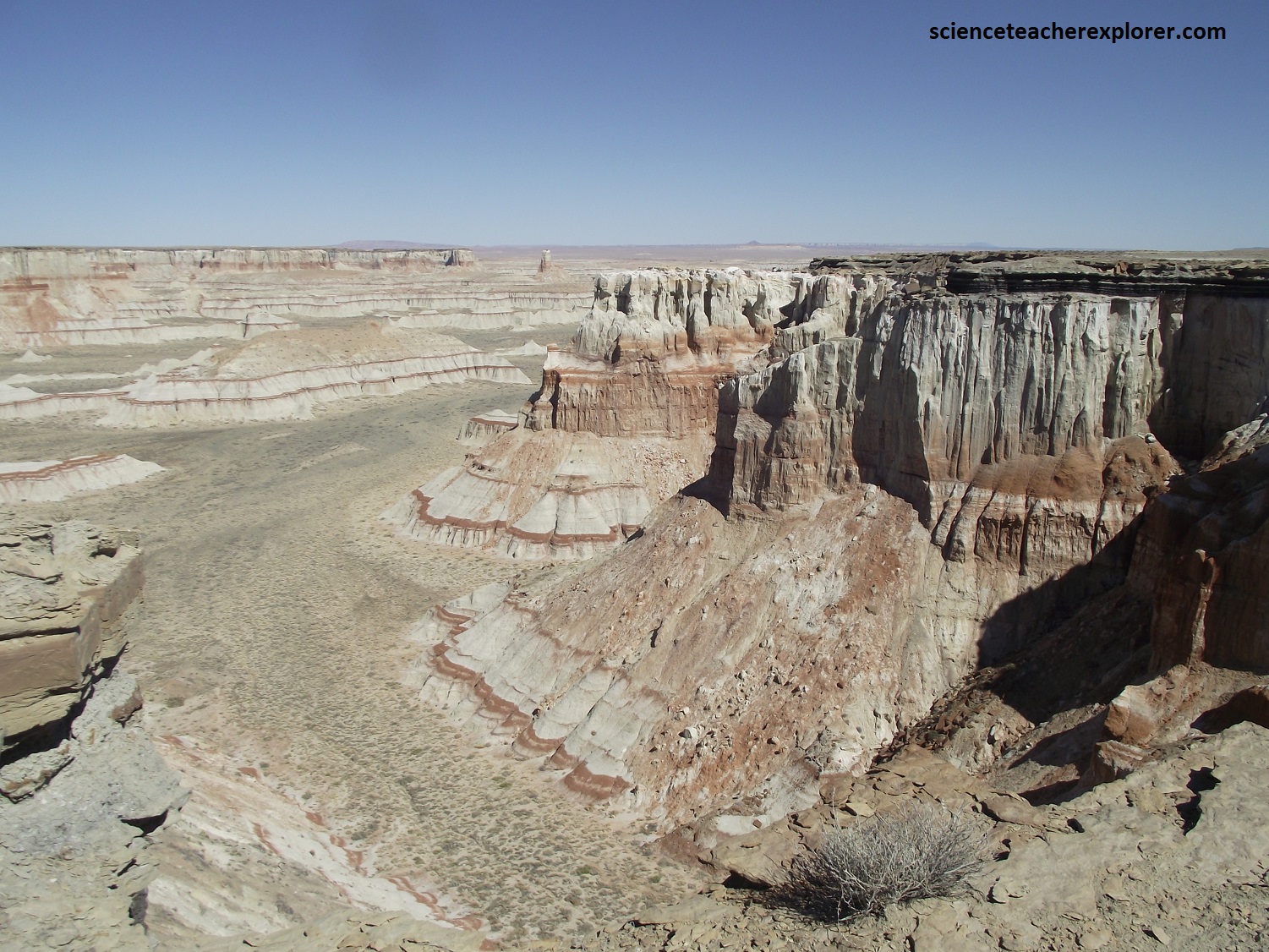 Pictured above, Coal Mine Canyon turns into Blue Canyon along the Moenkopi Wash heading east toward Red Lake on US 160. It’s known to the Navajo a “haahonooji”, meaning jagged, which describes the erosion patterns in the canyon. Its top layer is Dakota Sandstone overlying Cowsprings Sandstone. This gray sandstone deposited in streams that cut channels into the underlying Jurassic sandstone, draining into the coal swamps near the coast. A close look at this sandstone reveals that it is chock-full of black carbonized fragments of wood and plant material. The base of this layer represents the Jurassic-Cretaceous boundary and is an unconformity, because beneath this ledge there is a gap in the geologic record where older rocks were removed by erosion before the sandstone was deposited on top.